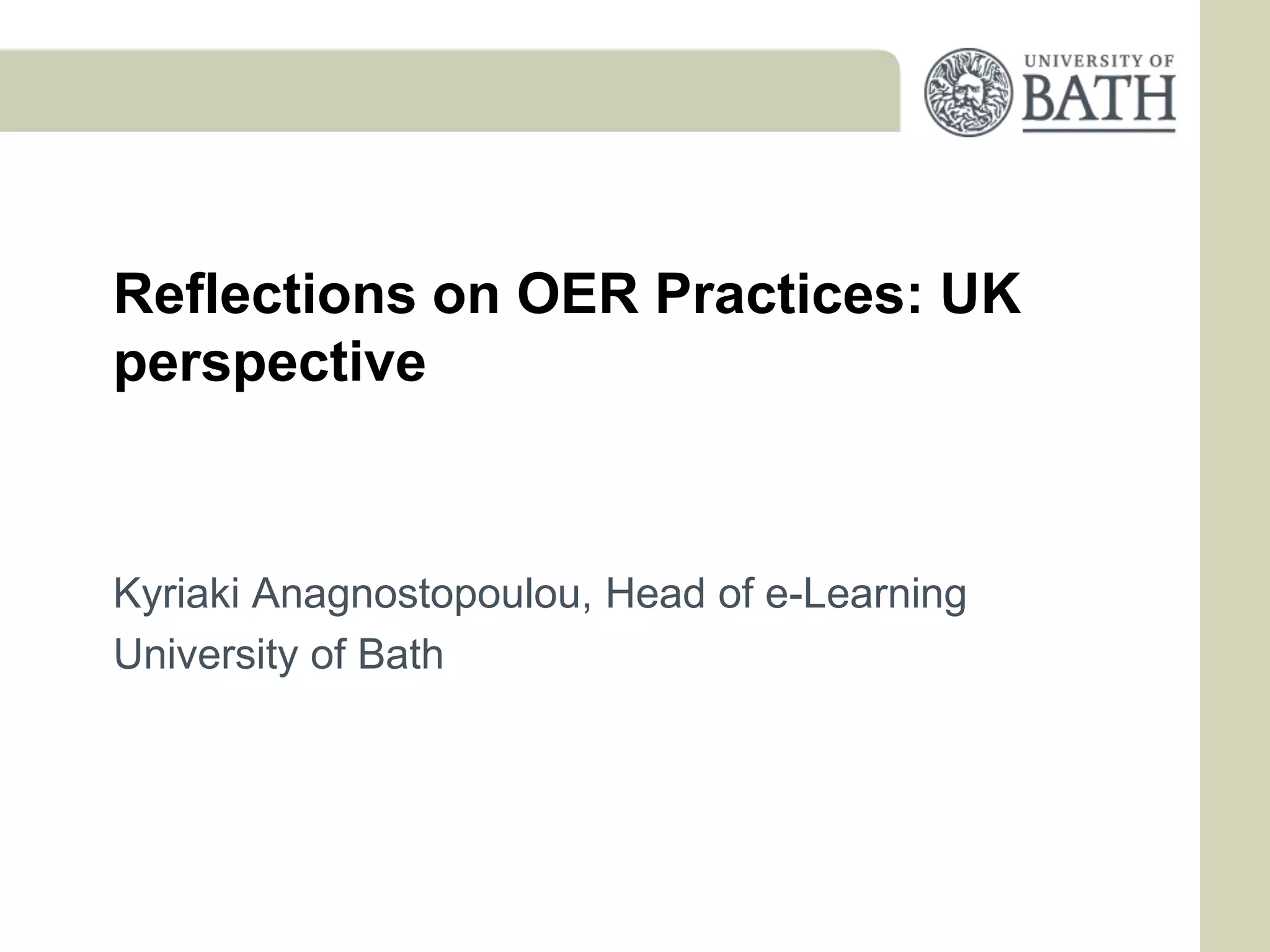 The document discusses open educational resources (OER) practices from a UK perspective. It notes that significant government funding has been available internationally to support OER development. Reasons to engage in OER development include improving access to learning materials, marketing and brand extension, and achieving economies of scale. The University of Bath's experience includes small-scale OER projects funded by JISC and the HEA. Engaging in OER development is seen as a highly cultural and balancing experience that can provide educational benefits through overcoming challenges in current practice. Key challenges for institutions include intellectual property, sustainability of initiatives, and discoverability of resources.