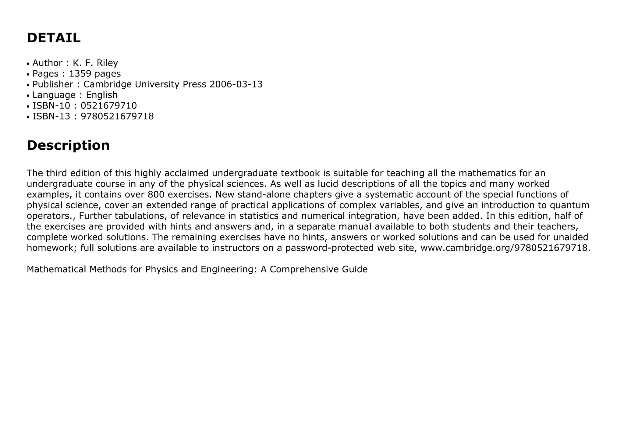 This document provides information about the book "Mathematical Methods for Physics and Engineering: A Comprehensive Guide" by K. F. Riley. The book is a 1359 page undergraduate textbook covering all the mathematics needed for an undergraduate course in the physical sciences. It contains worked examples, over 800 exercises, and new chapters on special functions, complex variables, and quantum operators. Half of the exercises come with hints and answers, with full solutions available to instructors online.