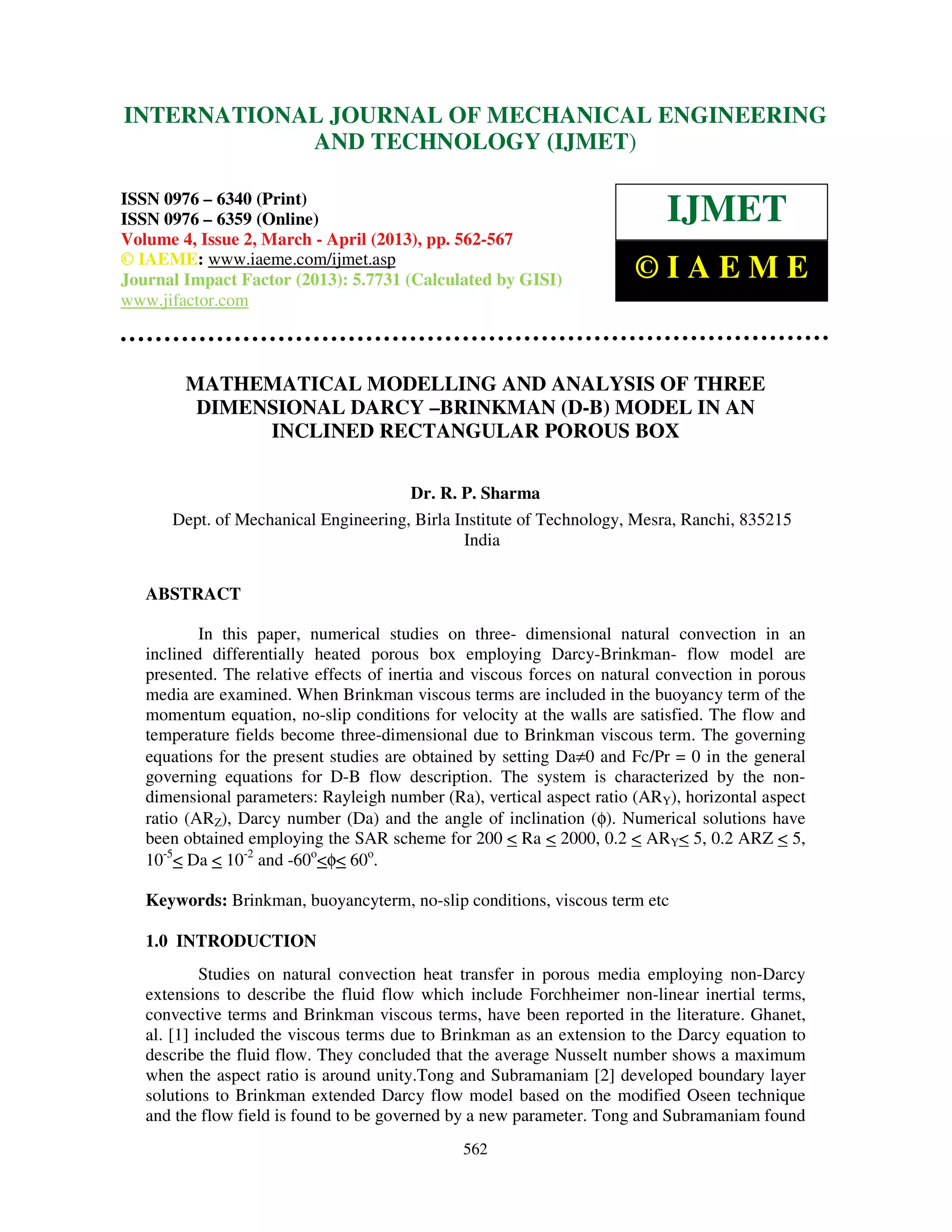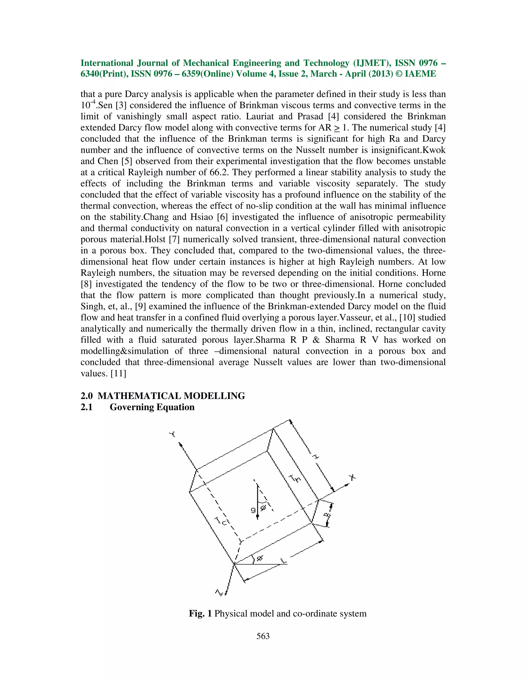 This document presents a mathematical model and numerical analysis of three-dimensional natural convection in an inclined porous box using the Darcy-Brinkman flow model. Governing equations for mass, momentum and energy are derived in dimensionless form using parameters like Rayleigh number, Darcy number, and aspect ratios. Numerical solutions are obtained for varying parameters like Rayleigh number, Darcy number, and angle of inclination. Results show that average Nusselt number first increases and then decreases with inclination angle, due to a transition from multicellular to unicellular flow patterns. Three-dimensional effects are more pronounced at lower aspect ratios.