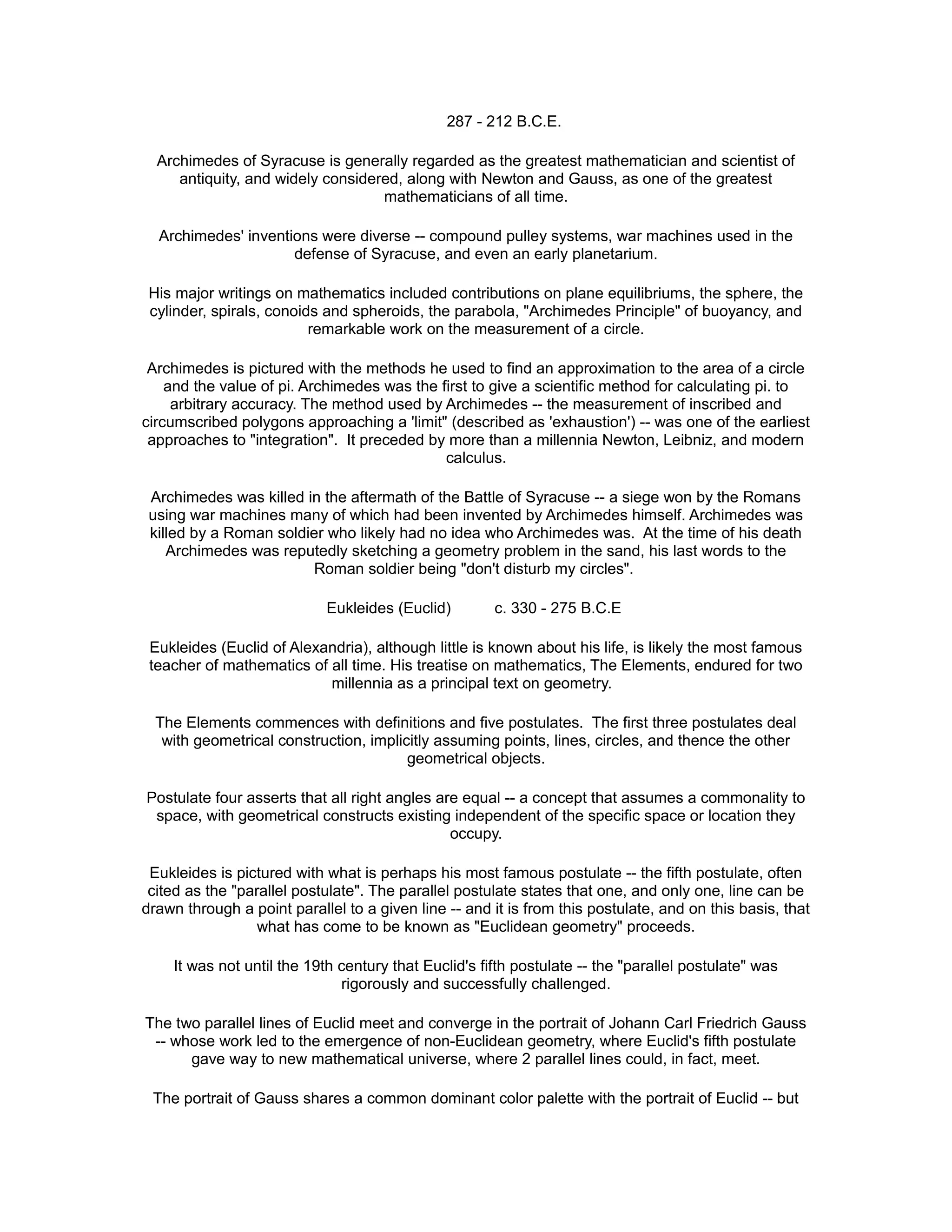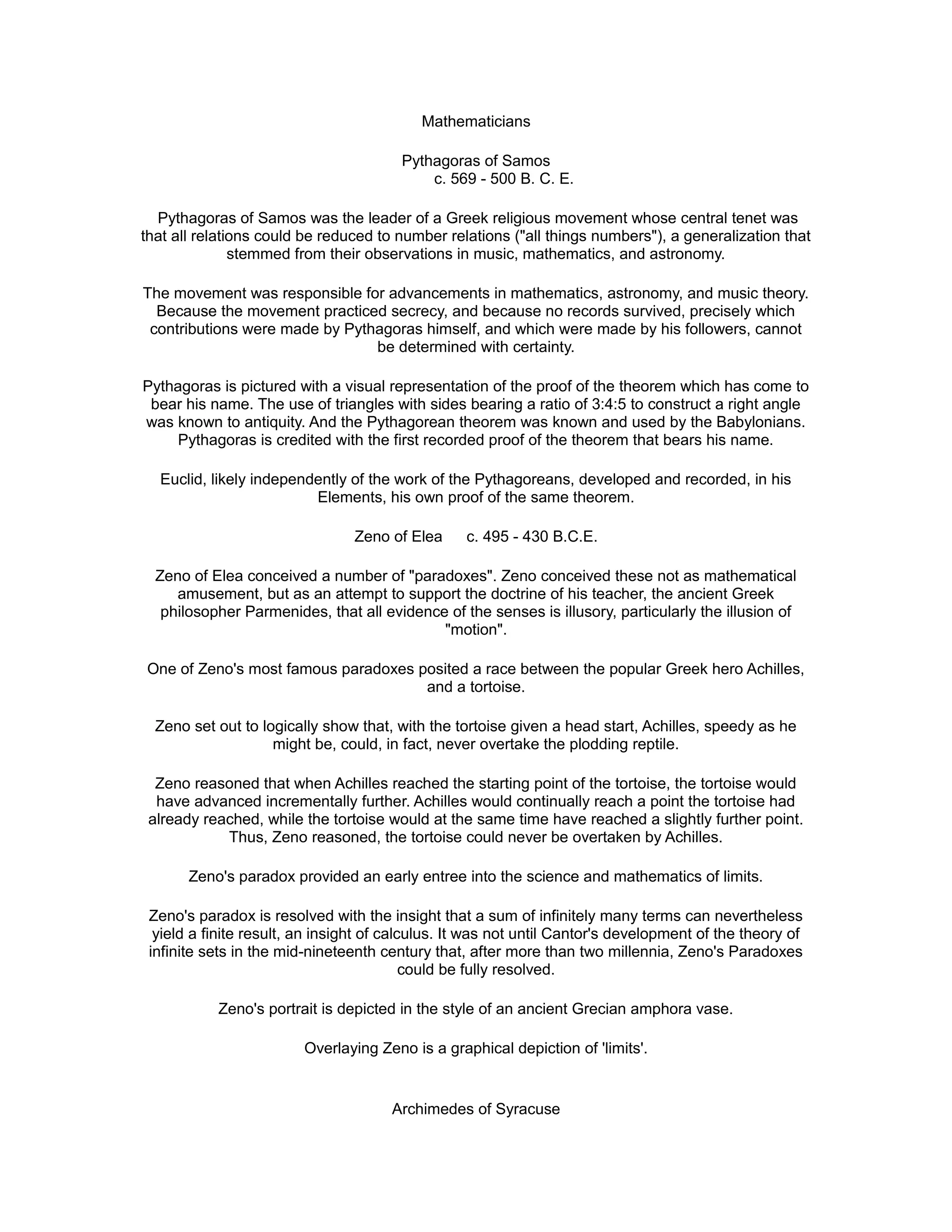Pythagoras and Zeno made early contributions to mathematics and philosophy. Pythagoras is credited with the first proof of the Pythagorean theorem, while Zeno conceived paradoxes to support Parmenides' view that motion is illusory. Archimedes made seminal advances in geometry, measurement of pi, and buoyancy. Euclid's Elements was a principal geometry text for over 2000 years, developing proofs from postulates including the parallel postulate. Later mathematicians like Descartes, Fermat, Pascal, Newton, Euler, Cantor further advanced fields like algebra, calculus, probability, and the theory of infinite sets.