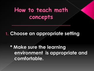 The document provides guidance on how to plan an effective lesson for teaching mathematics to preschool students. It recommends 1) choosing an appropriate topic, 2) writing a measurable objective stating what students will be able to do, 3) listing required materials, 4) outlining lesson steps, 5) planning an assessment to evaluate understanding, 6) explaining how the lesson transitions to the next, and 7) leaving space to reflect on the lesson's effectiveness. The goal is to create a well-structured lesson that helps preschoolers learn mathematical concepts.