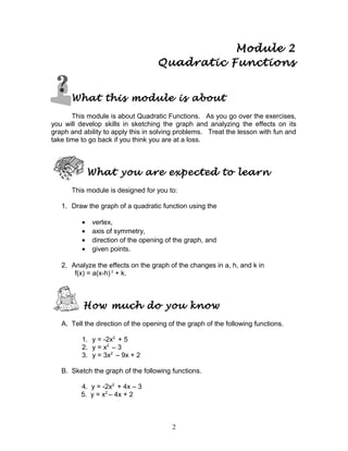 This document is a comprehensive educational module on quadratic functions for secondary education, covering topics such as graphing techniques, the effects of parameters on the parabola's shape, and translations of the graph. It includes exercises aimed at developing skills in drawing graphs, analyzing changes in coefficients, and understanding the characteristics of quadratic functions. The module emphasizes step-by-step methods for graphing and translating parabolas, with clear examples and practice problems.