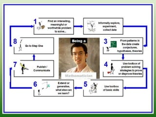 This document outlines a professional development session for teachers on implementing changes to the teaching of mathematics at RPPS. It introduces the "Mathematician's Model" which involves dividing math lessons into four "toolbox lessons" focusing on developing problem solving strategies and mental math skills, and two "Be a Mathematician" lessons using rich, open-ended tasks. Examples of effective rich tasks are provided, emphasizing that they should be problem-based, inquiry-driven, collaborative, and engage students through hands-on experiences. The session celebrates mathematicians as role models and quotes Paul Halmos emphasizing experimentation and problem-solving over memorization of facts.
