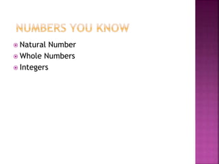 Rational numbers include integers, fractions, and numbers that can be expressed as a ratio of two integers, like p/q. Rational numbers can be positive or negative depending on whether the numerator and denominator have the same or different signs. Any rational number can be expressed in its standard form by dividing the numerator and denominator by their greatest common factor.