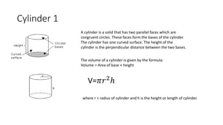 The document discusses the formulas for calculating the volumes of different geometric solids. It provides the formulas to calculate: