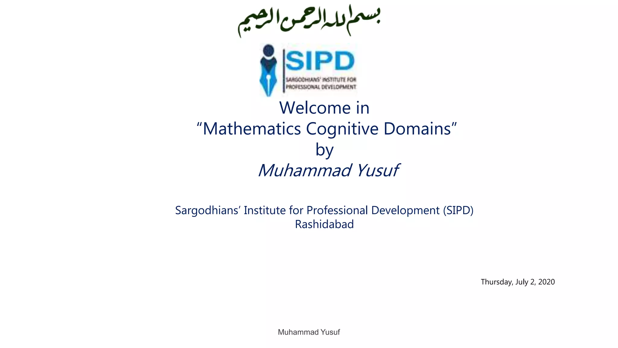 This document contains an introduction to a presentation on mathematics cognitive domains by Muhammad Yusuf from Sargodhians' Institute for Professional Development. It includes examples of questions classified into three cognitive domains: Knowing, Applying, and Reasoning. The presentation aims to discuss how focusing on developing conceptual understanding through problem solving and reasoning can help students learn mathematics more effectively than just memorizing procedures and facts.