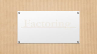 Factoring involves finding the factors of an expression, reversing the process of multiplication. Key techniques include identifying the greatest common factor (GCF), factoring by grouping, and using properties of polynomials. The document emphasizes step-by-step methods for factoring various polynomial expressions and distinguishing factorable from non-factorable polynomials.