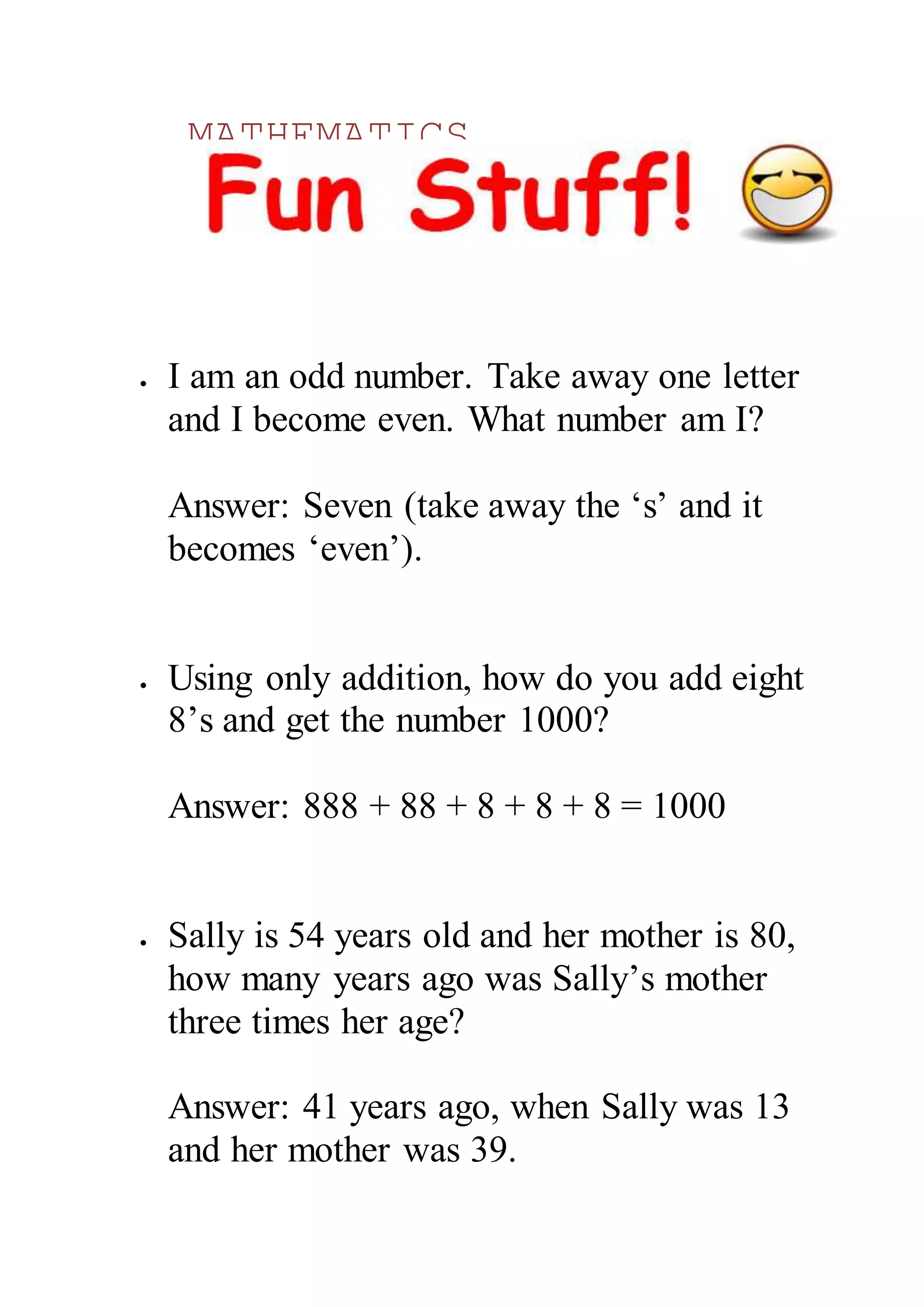This document contains a collection of math puzzles, riddles, facts, and tricks. It includes 7 math puzzles or riddles with the answers provided. Some examples include a riddle about the number seven and a puzzle involving adding 8 eights to get 1000. It also shares 13 interesting math facts such as the origins of terms like mathematics and zero. Facts cover topics like the Fibonacci sequence, divisibility rules, and connections between numbers like 111,111,111. The document aims to inform and entertain the reader with curiosities in mathematics.