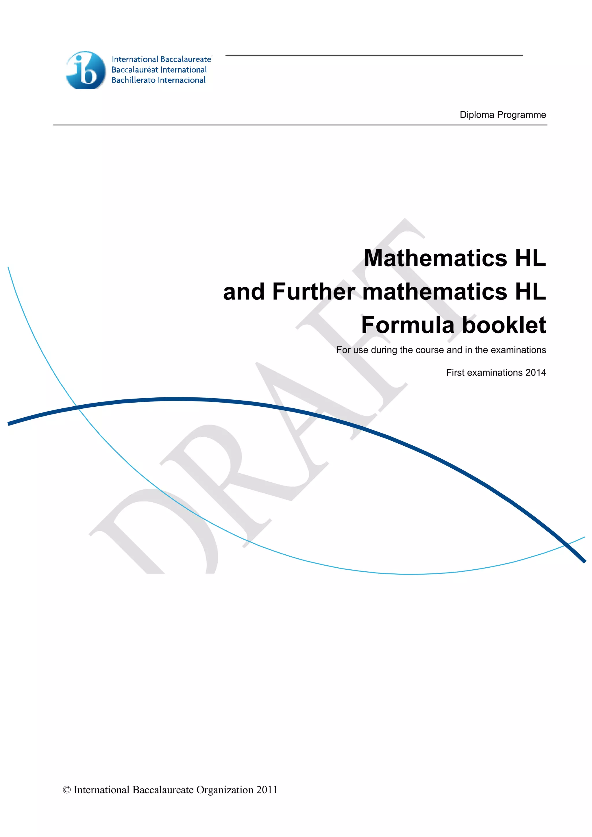 The document is a formula booklet for the International Baccalaureate's Mathematics HL and Further Mathematics HL courses. It includes essential mathematical formulas across various topics such as algebra, functions, trigonometry, statistics, probability, and calculus, intended for students during their coursework and examinations. This resource is structured into sections covering different mathematical concepts and their key formulas.