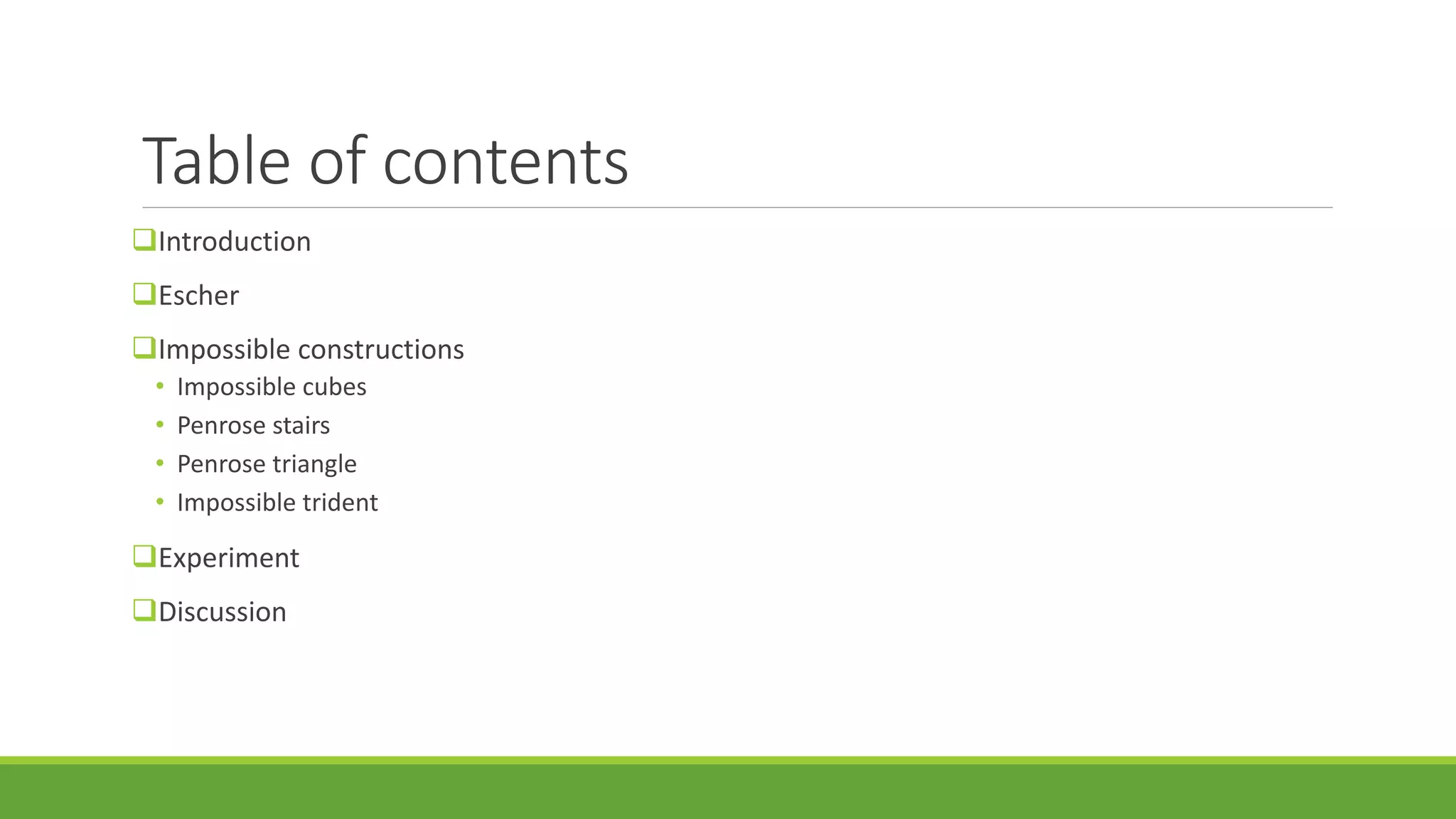 This document summarizes research on impossible constructions in mathematics and architecture. It discusses M.C. Escher's work with impossible constructions and defines different types of impossible shapes like impossible cubes, Penrose stairs, the Penrose triangle, and the impossible trident. The document then describes an experiment where the researchers attempted to draw Penrose triangles from memory without references. Most of the triangles drawn were successful, showing that these impossible shapes can be reproduced without copying. The conclusion discusses the collaboration between the researchers and challenges of meeting deadlines during the holiday season.