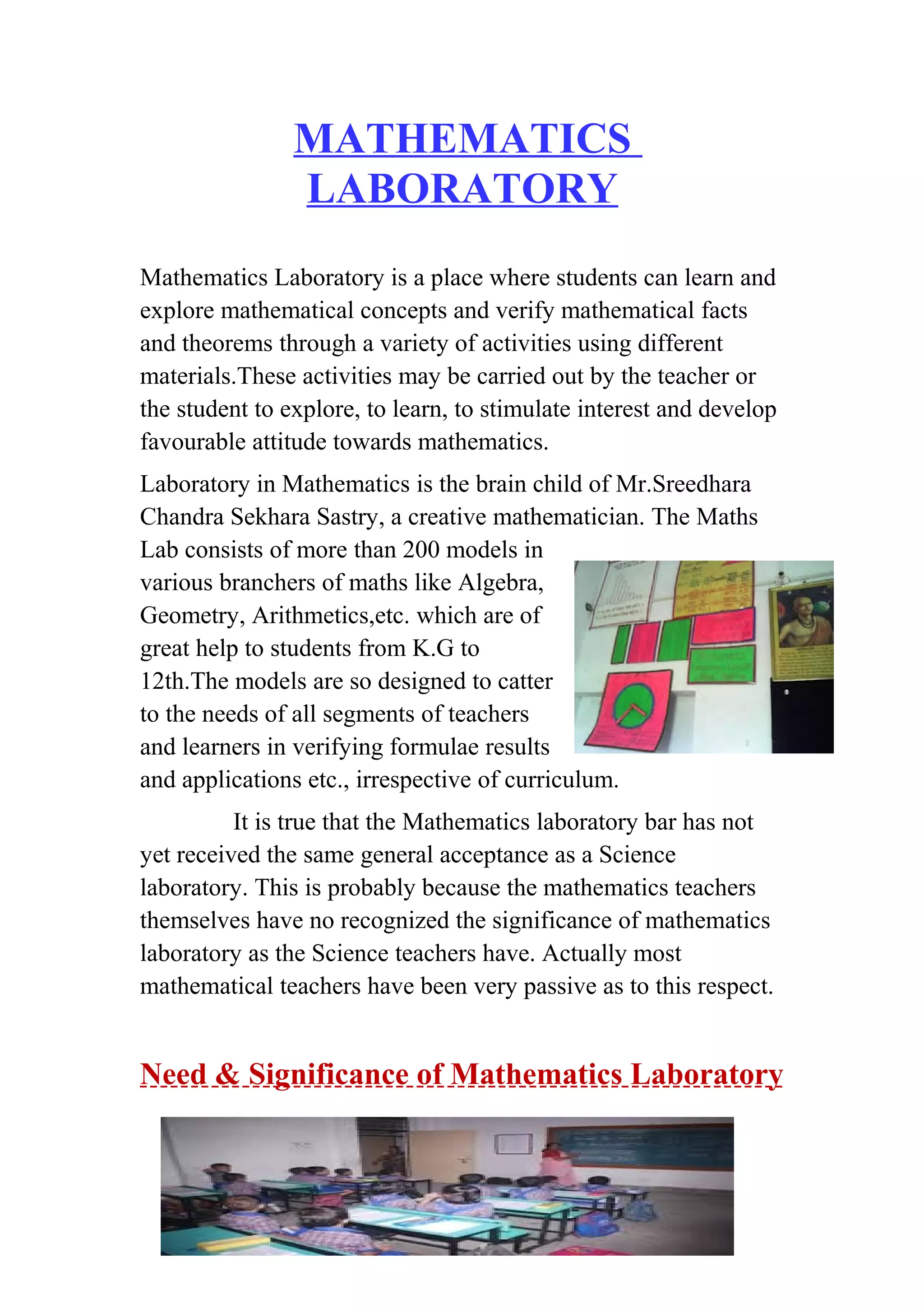 The document describes a mathematics laboratory, which is a place where students can learn and explore mathematical concepts through hands-on activities using various materials. The lab was created by Mr. Sreedhara Chandra Sekhara Sastry and contains over 200 models covering different areas of math. The lab aims to make math teaching and learning more interesting and help students better understand abstract concepts through experiments and use of physical objects and equipment. The lab should be equipped with materials like beads and balances, as well as models, charts, drawings tools and measuring instruments to facilitate hands-on learning.