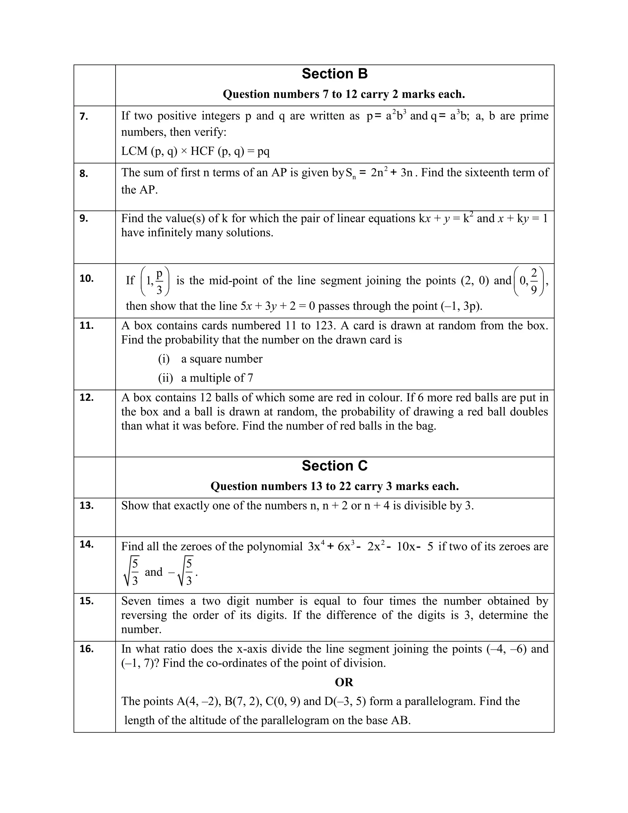This document contains a sample question paper for Class X Mathematics for the academic year 2017-18. It includes 30 questions divided into four sections, with varying marks assigned to each question type, and specifies that all questions are compulsory without overall choice. Key topics include rational numbers, quadratic equations, arithmetic progressions, probability, geometry, and trigonometry, along with various problem-solving tasks.