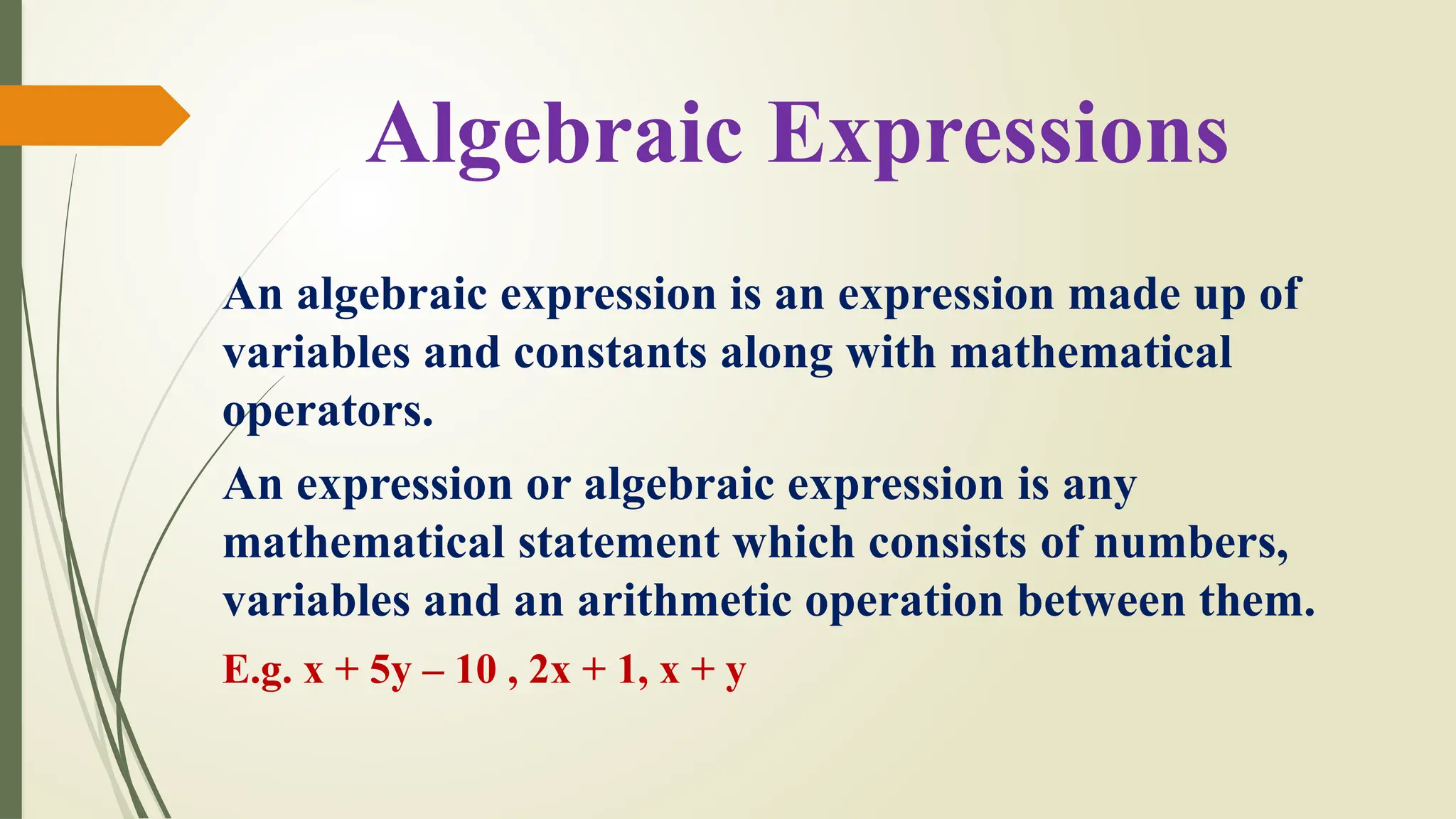 The document explains algebraic expressions, specifically defining polynomials as algebraic expressions with whole number exponents. It classifies polynomials based on the number of terms (monomial, binomial, trinomial) and degree (linear, quadratic, cubic). Examples illustrate the characteristics and classifications of polynomials.