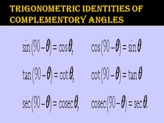 Trigonometry is a branch of mathematics that studies relationships involving lengths and angles of triangles. It emerged during the 3rd century BC from applications of geometry to astronomy. Hipparchus is considered the founder of trigonometry, compiling the first trigonometric table in the 2nd century BC. Key trigonometric functions like sine, cosine, and tangent were discovered between the 5th-10th centuries CE by mathematicians including Aryabhata, Muhammad ibn Musa al-Khwarizmi, and Abu al-Wafa. Trigonometry is applied to calculate angles of elevation and depression used in applications like determining the angle an airplane is viewed from the ground.