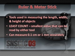 The document discusses various measurement units and systems including metric and English/imperial units. It provides examples of converting between units for length, mass, volume, temperature and other quantities. Dimensional analysis is introduced as a method for solving measurement conversion problems by analyzing the units involved. Word problems combining multiple conversion steps are presented as practice examples.