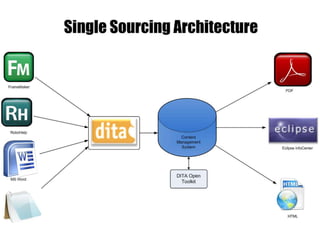 This document discusses adopting the Darwin Information Typing Architecture (DITA) standard for technical documentation. It provides an overview of key DITA concepts like topics, maps, and building blocks. It also covers how to create DITA topics, generate output using the DITA Open Toolkit, and profile content using DITAVAL. The presentation aims to dispel myths about DITA being long and boring while providing practical tips through examples and demonstrations.