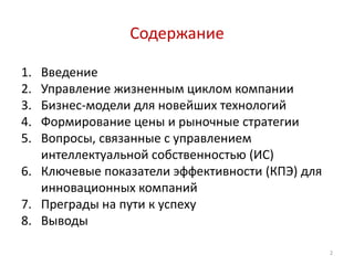 Документ посвящен управлению инновациями в высокотехнологичных компаниях, рассматривая жизненные циклы, бизнес-модели и маркетинговые стратегии для успешного развития. Основное внимание уделяется процессам, связанным с интеллектуальной собственностью, ключевым показателям эффективности и преодолению преград на пути к успеху. Презентация охватывает различные аспекты, от стадии разработки до выхода на рынок, подчеркивая важность адаптации к рыночным условиям и потребностям клиентов.