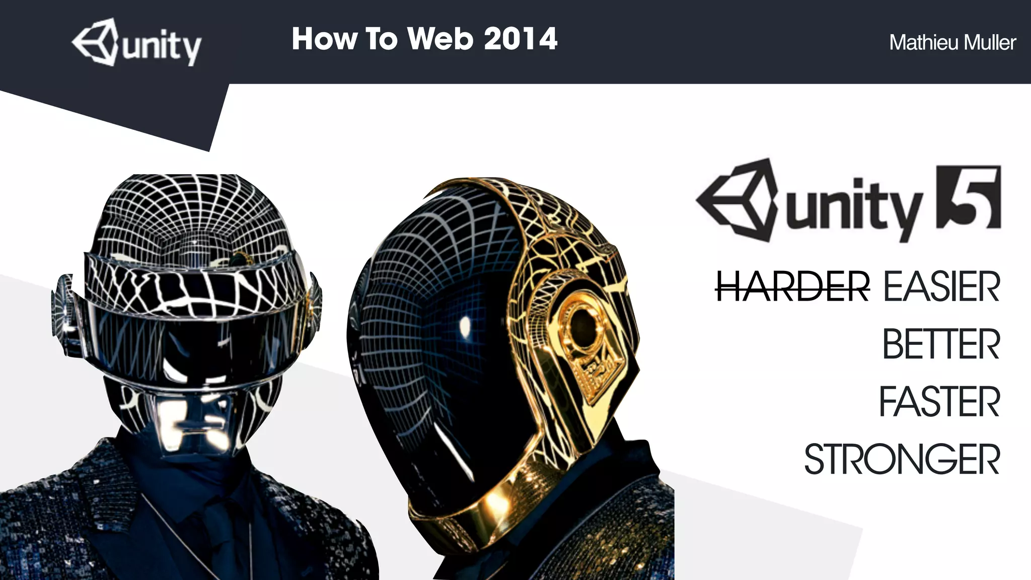 Mathieu Muller presented on Unity's advancements in 2014, highlighting its ease of use, improved features, and faster performance enhancements. Key updates included global illumination, multi-threaded physics, and the introduction of Unity Pro for free, alongside partnerships with Oculus Rift and others. The presentation also touched on upcoming features like analytics and cloud collaboration.