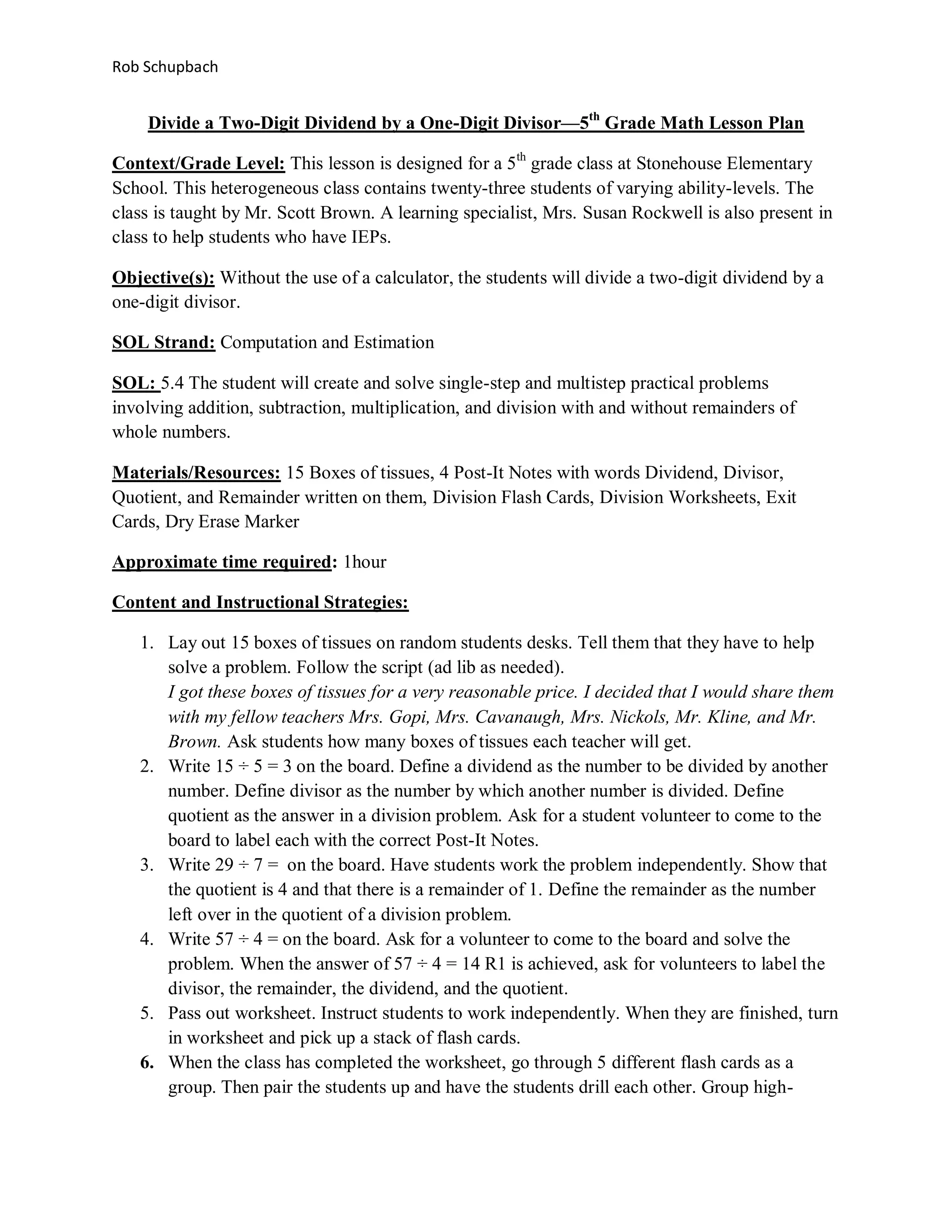 This lesson plan is for a 5th grade math class to teach dividing two-digit dividends by one-digit divisors without calculators. The teacher will use boxes of tissues and example word problems to demonstrate the concepts of dividend, divisor, quotient, and remainder. Students will then complete a worksheet independently and practice with flash cards in pairs. To assess understanding, students will complete an exit card word problem about dividing marbles between brothers. The learning specialist will support students with IEPs.