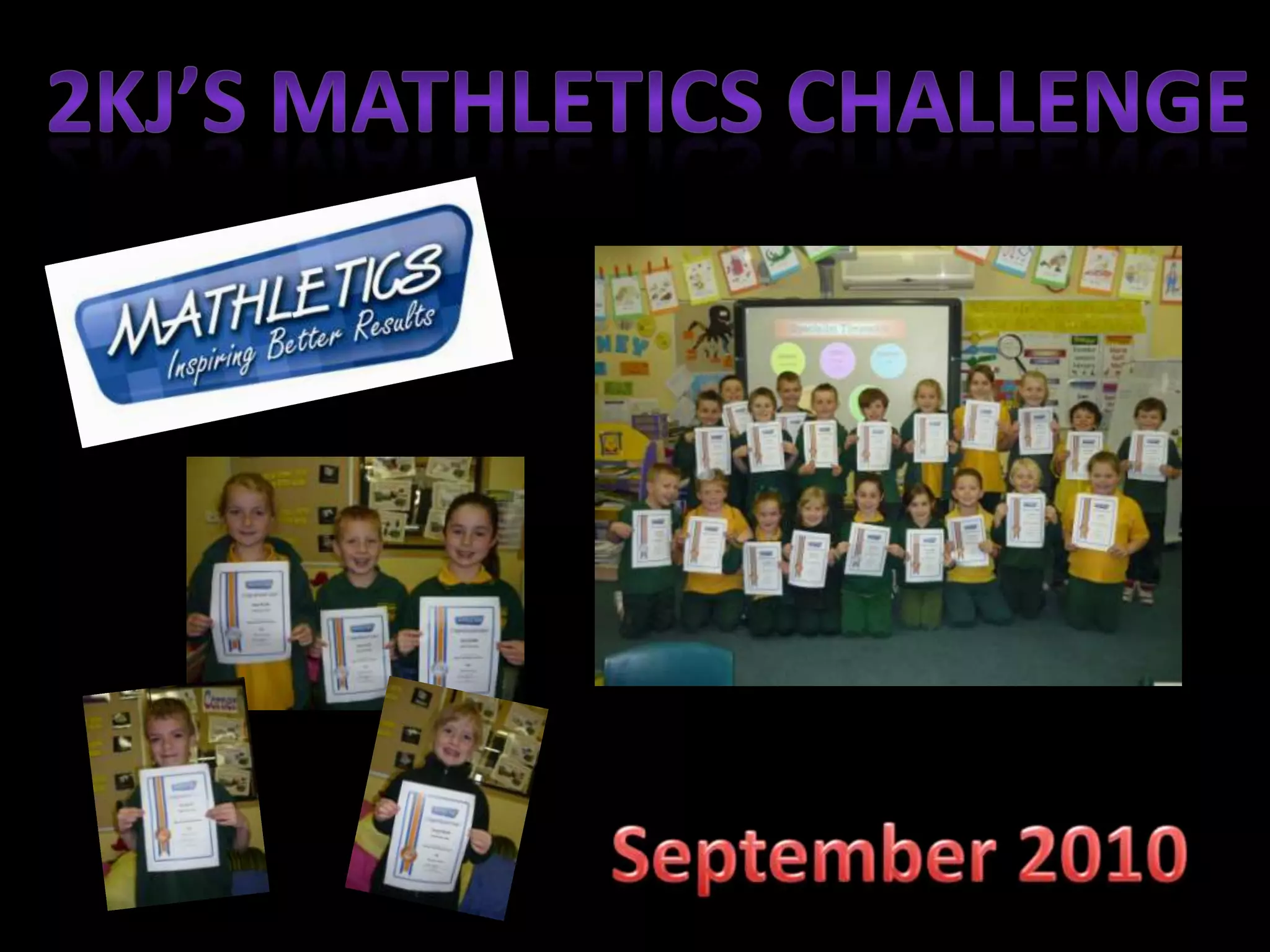This photo album from September 2010 documents a Mathletics challenge held by 2KJ and includes photos of 16 students who participated: Emily, Ronan, Spencer, Dylan, Seth, Max, Connor, James, Heath, Amelia, James, Skye, Jaz, Marcus, Georgia, Jamie, Thomas, Kealee, Lucy, and Leah. The album concludes by congratulating everyone with the message "The silver certificates! Well done everyone!"