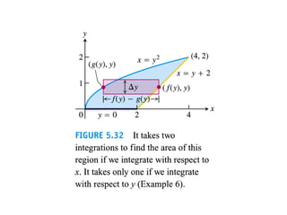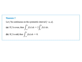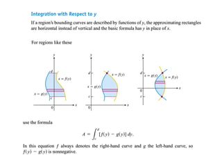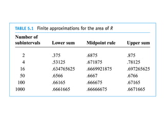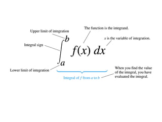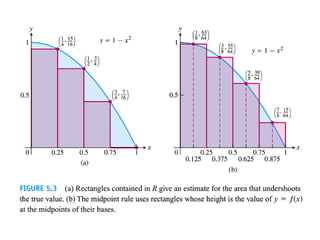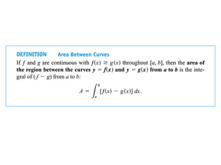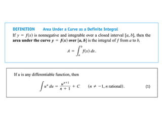 The document discusses the process of estimating areas under curves using definite integrals, featuring multiple examples of calculating such areas using different functions. It highlights key steps, including sketching the curves, determining integration limits, and applying integration techniques. Additionally, it presents various scenarios involving intersections and areas bounded by curves.