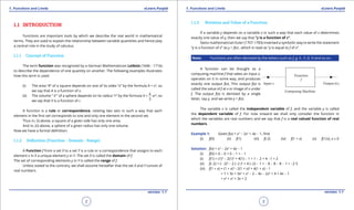 This document provides an introduction to functions and their key concepts. It defines a function as a rule that assigns each element in one set to a unique element in another set. Functions can be represented graphically and algebraically. Common types of functions discussed include polynomial, linear, constant, rational, trigonometric, inverse trigonometric, exponential, logarithmic, and hyperbolic functions. Examples are provided to illustrate domain, range, and graphing of different function types.
