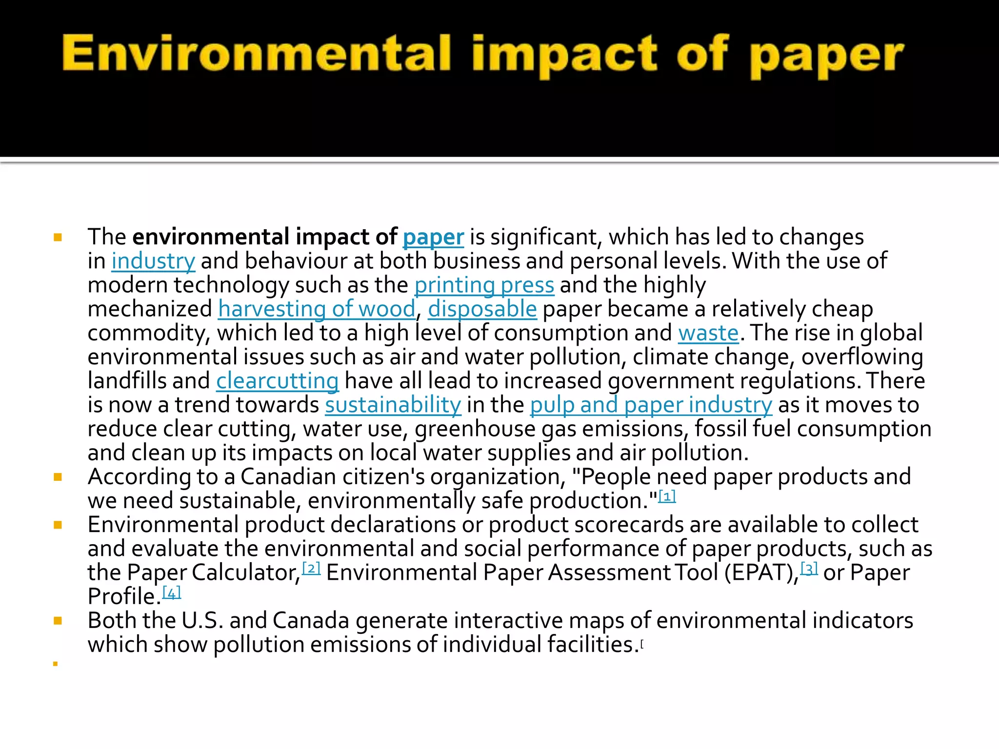 The environmental impact of paper production is significant, as the industry is one of the largest polluters of air, water, and land. Increased use of disposable paper led to high levels of consumption and waste. There is now a trend toward sustainability in the pulp and paper industry through reducing pollution, emissions, and impacts on local water and air quality. Paper production generates substantial emissions and pollution, and is a major contributor to deforestation and climate change through methane emissions from decomposing paper. Recycling and reducing paper use can help address these environmental impacts.
