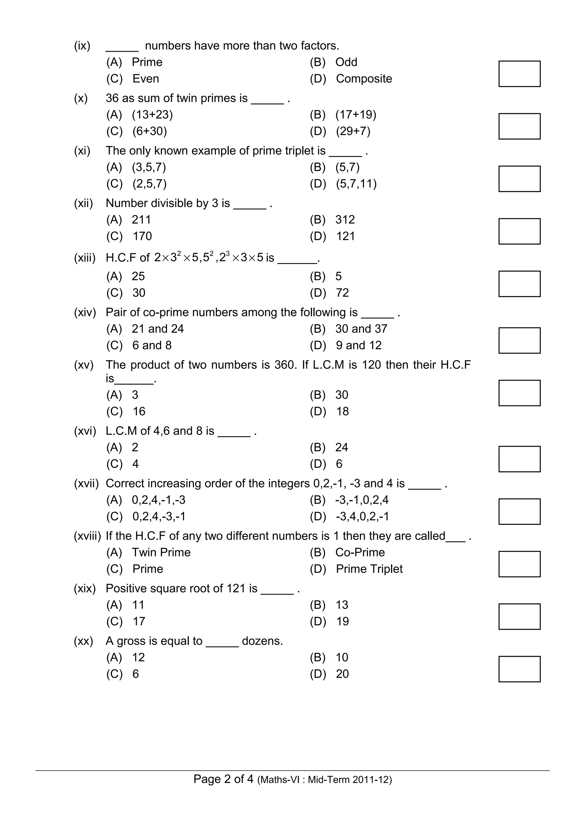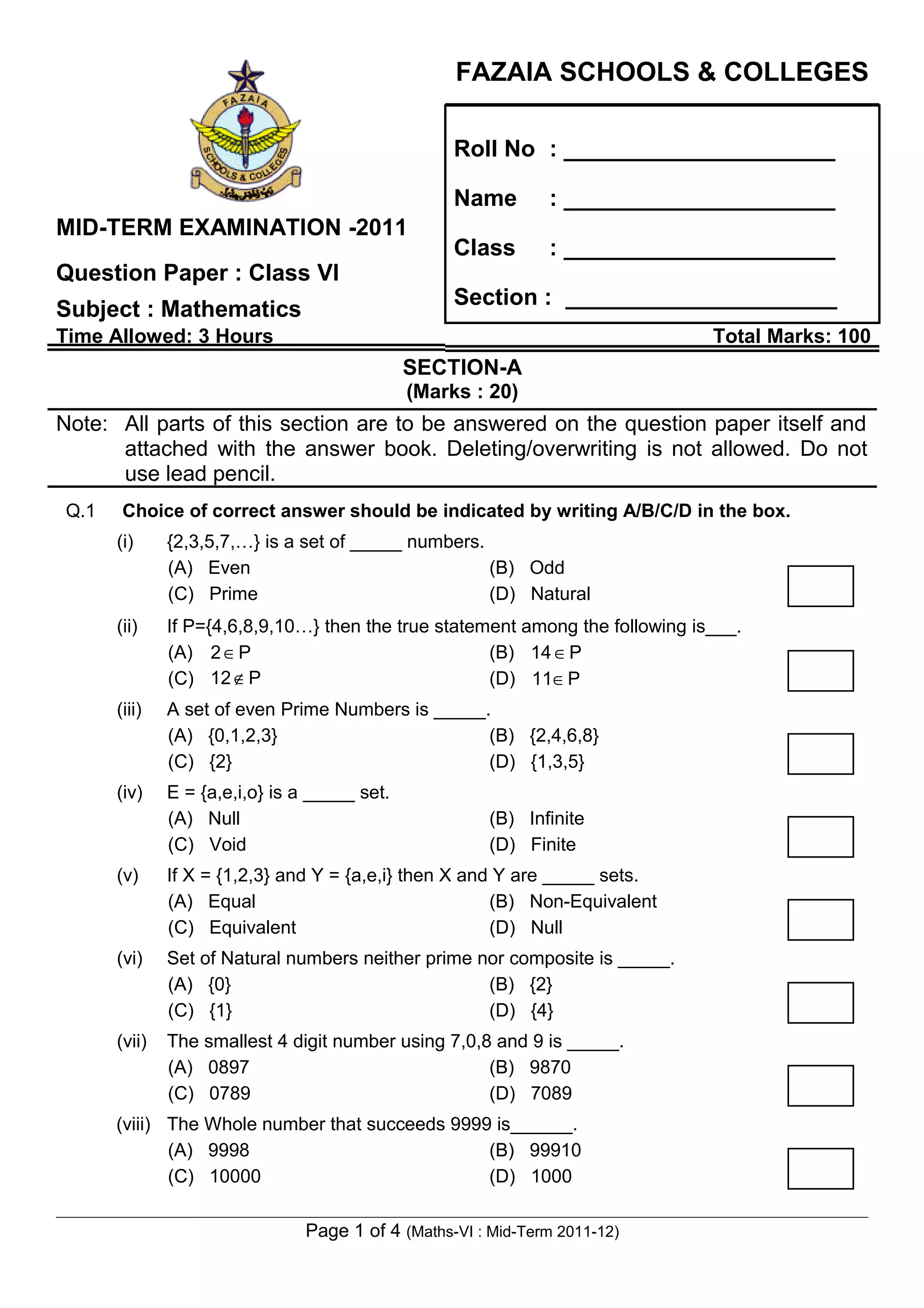 This document contains a mid-term examination for 6th class mathematics from Fazia Schools & Colleges. The exam has 3 sections: Section A with 20 multiple choice questions, Section B with 10 short answer questions worth 4 marks each, and Section C with 5 long answer questions worth 8 marks each. The exam covers topics in mathematics including sets, numbers, operations, ratios, and word problems. Students are asked to show their work, find sums, quotients, greatest common factors, least common multiples, and solve other mathematical problems.
