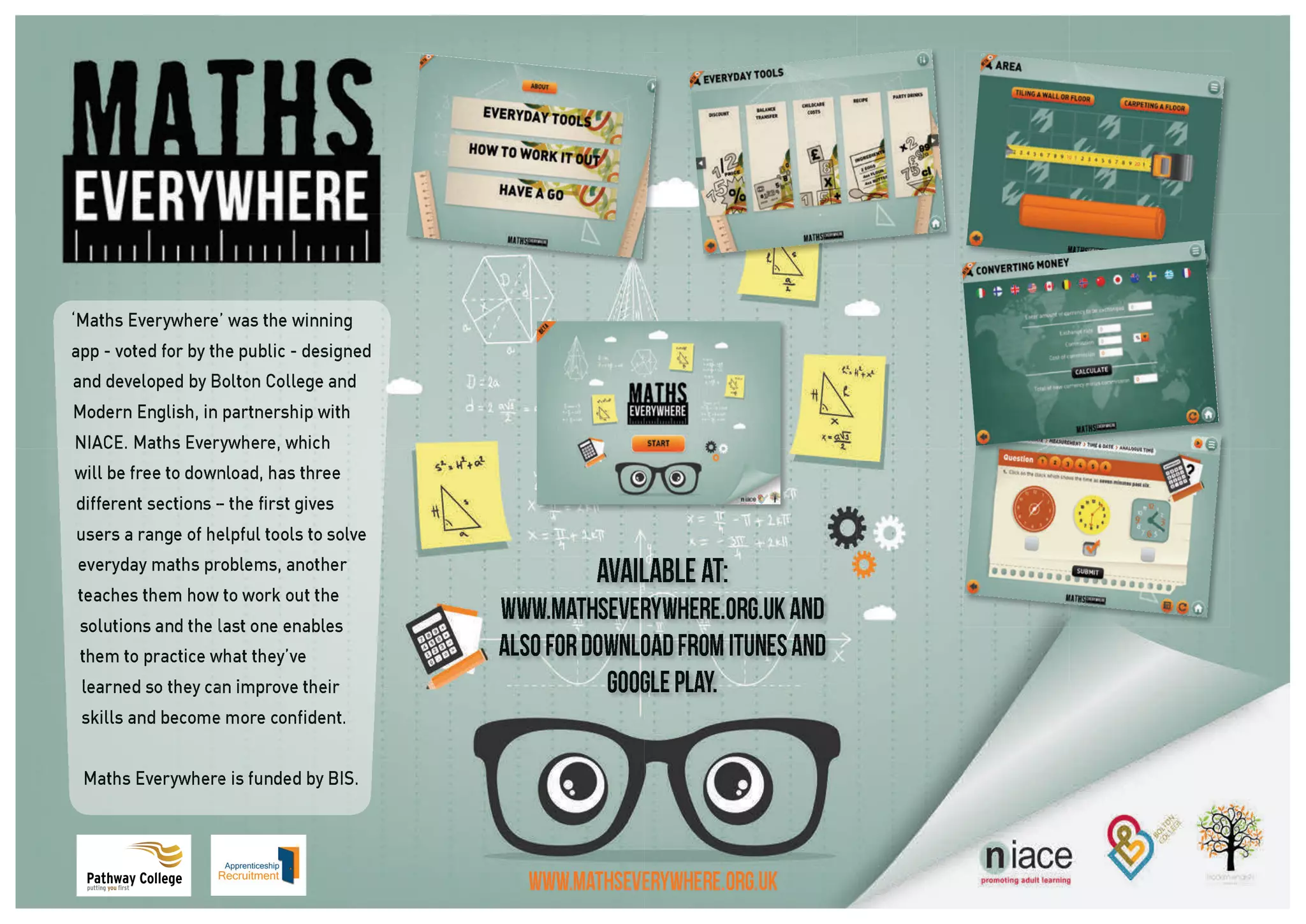 The document is a promotional poster for Maths Everywhere, an initiative by Pathway College aimed at prioritizing students' needs in mathematics education. The website link provided suggests further resources for support in learning mathematics.