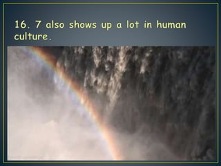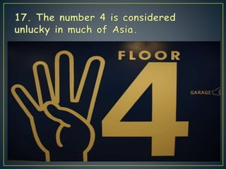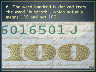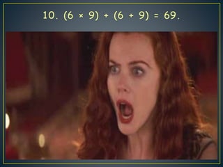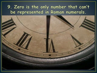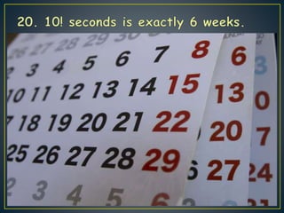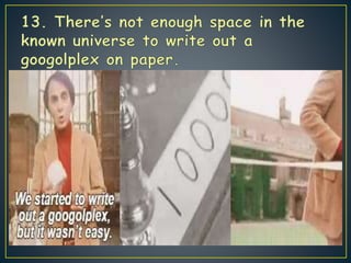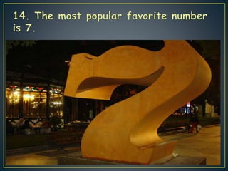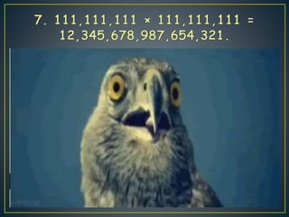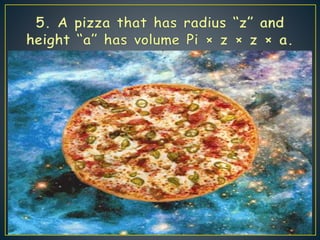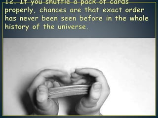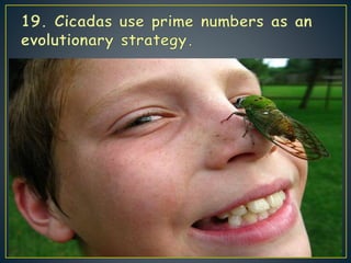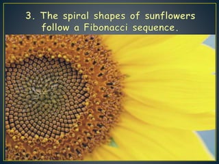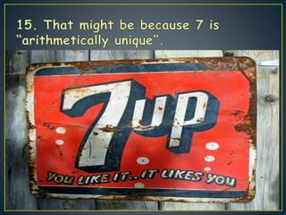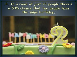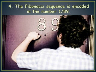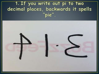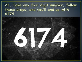 This document contains 15 math facts presented by Pawan Mishra. Some of the facts included are: the Fibonacci sequence shows up in nature; 1/89 can be written as an infinite decimal; the volume of a circle formula uses Pi; the Birthday Problem states that in a room of 75 people there is a 99% chance of two people having the same birthday; and Kaprekar's constant is the number 6174 that results from a specific calculation using four digit numbers.
