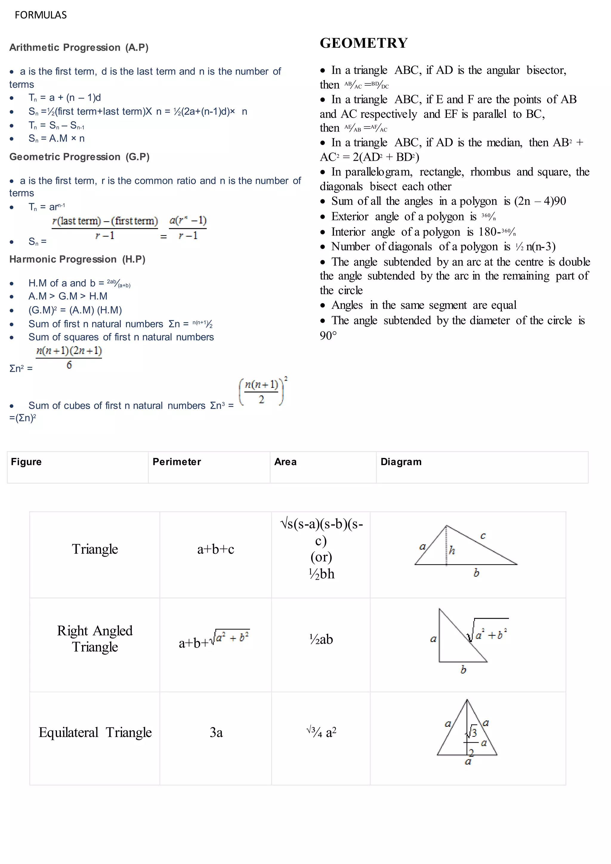 2. Formulas are given for topics like ratios, proportions, arithmetic and geometric progressions, simple and compound interest, mixtures and allegations, quadratic equations, triangles, circles, solids and their surface areas and volumes.
