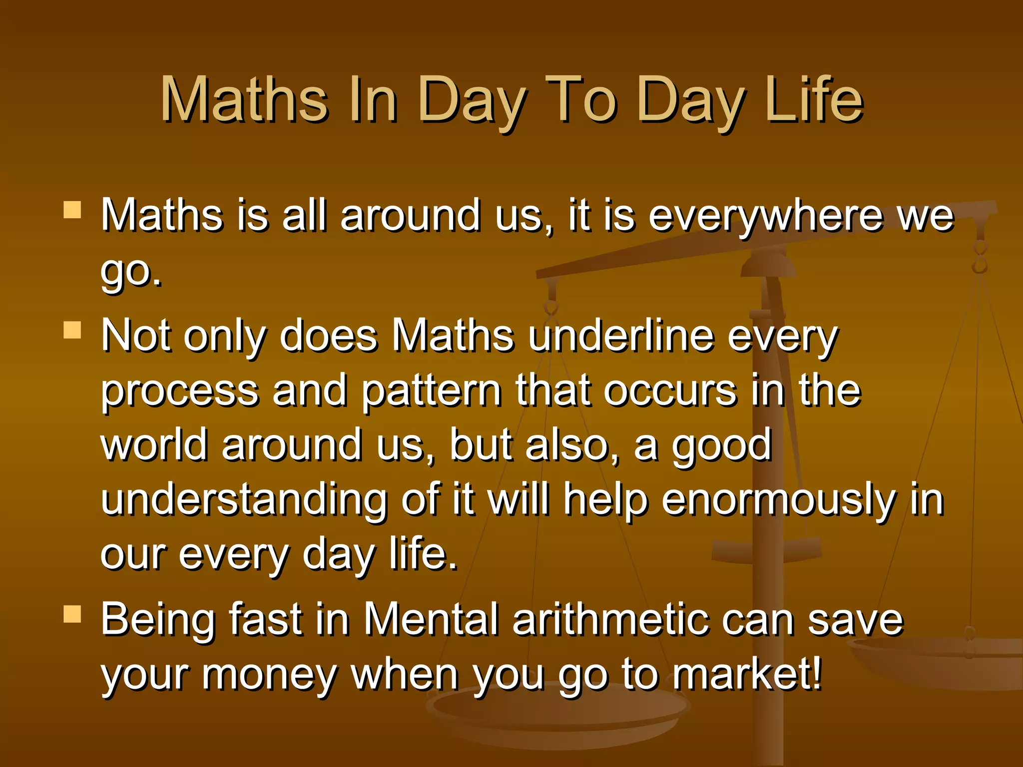 Mathematics is present in many aspects of daily life. It underlies processes that occur in the world and can help with tasks like mental arithmetic to save money. Math is used in commercial activities like discounts, banking, foreign exchange, stock prices, and calculations involving profit/loss, percentages, ratios, and time. Algebra can help determine which payment option is better for a job. Statistics are used to collect, analyze, interpret, present, predict, and forecast data. Concepts like mean, median, and mode help in areas like determining average daily expenditures or keeping optimal stock levels. Number theory and geometry have applications in coding, construction, and calculating areas. Mathematics also aids fields like biology, medicine, and modeling.