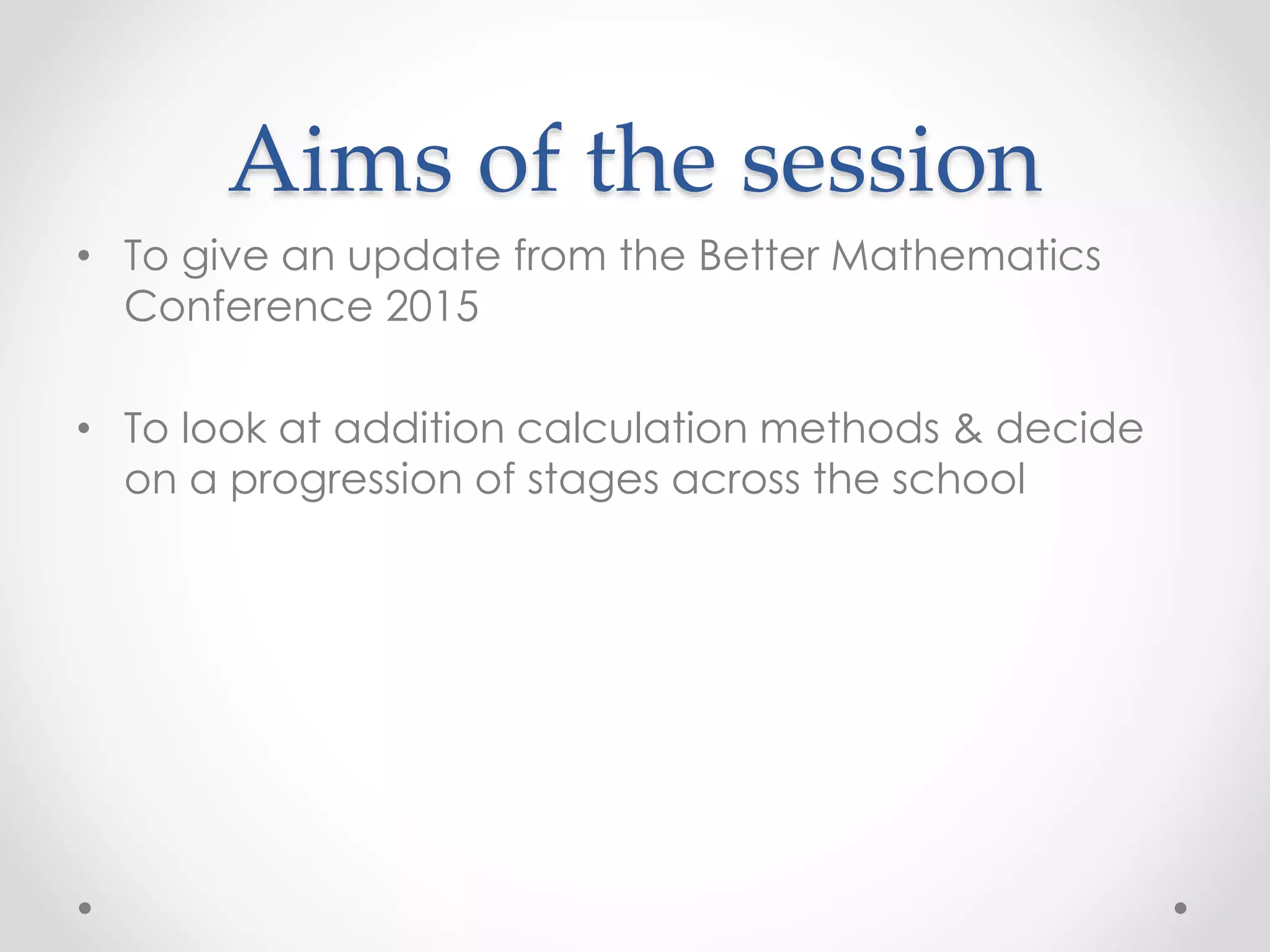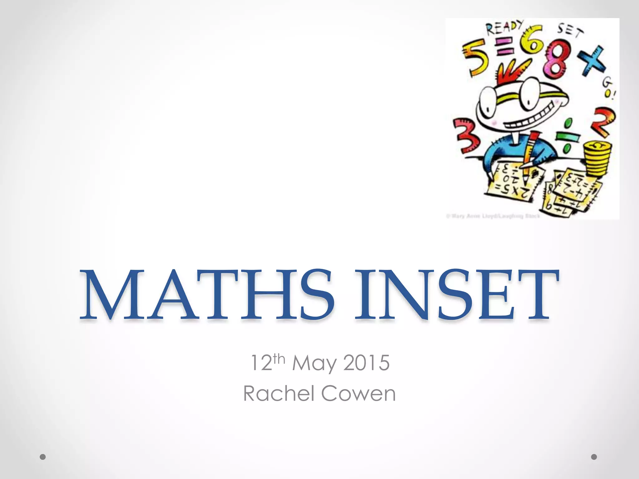 The document summarizes the key points from a maths inset for teachers. It outlines a proposed progression of addition calculation stages from counting all objects to the standard written method. Practical resources like number tracks and base 10 blocks are recommended for the early stages. Ensuring conceptual understanding, problem solving and choosing an appropriate method are emphasized. The next steps are to review calculation policies for other operations and use assessment to track individual progress through the stages.