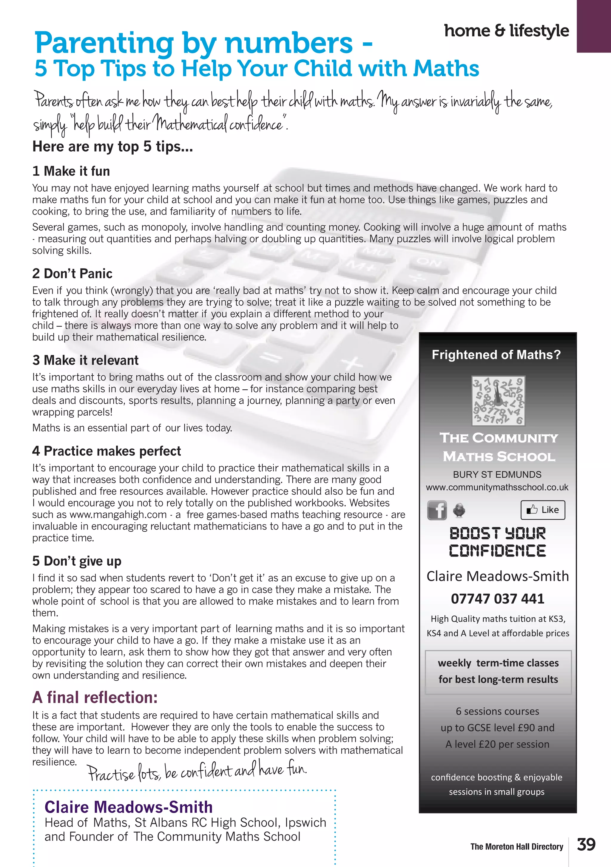 The document provides 5 tips for helping children build confidence in math: