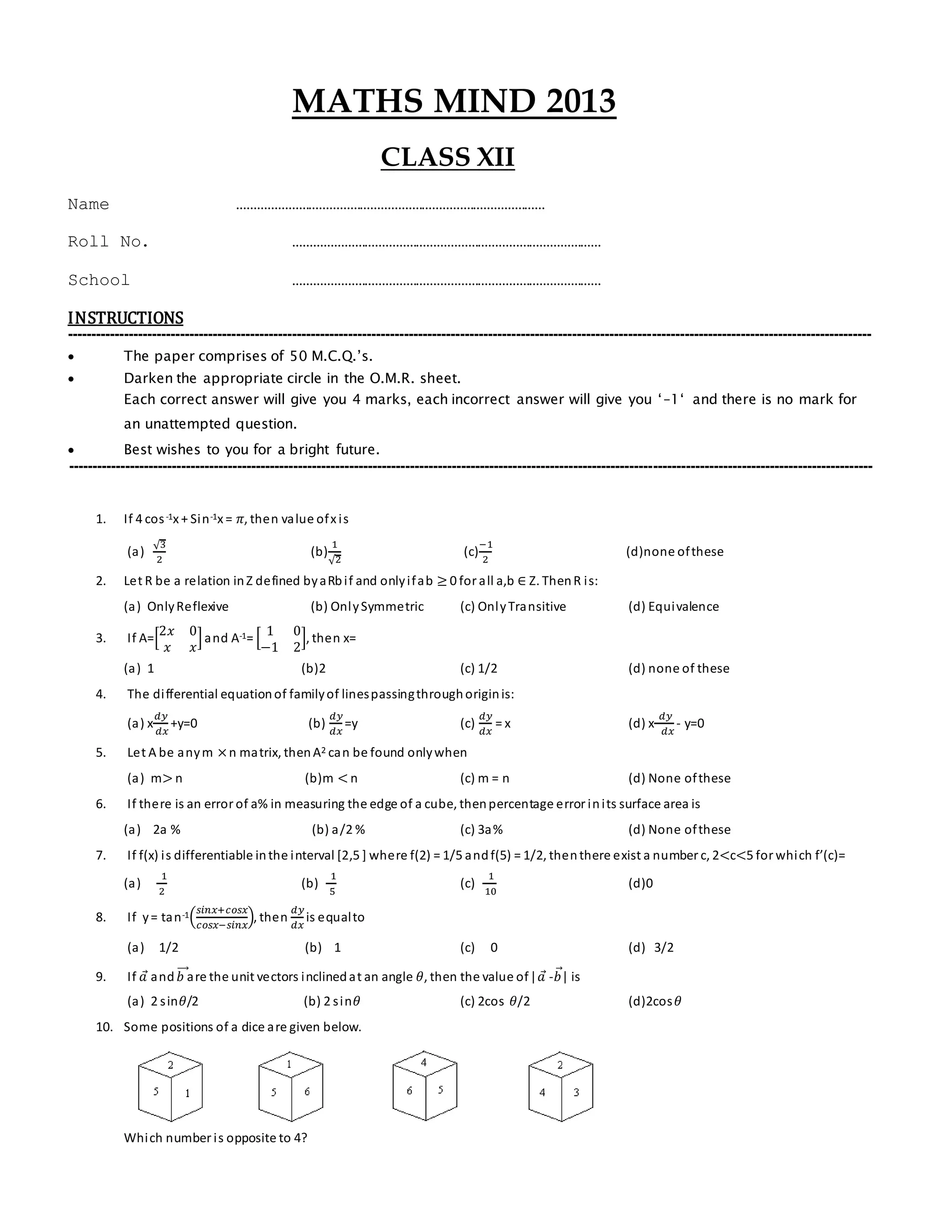 The document contains instructions for a math exam for Class XII. It states that the paper contains 50 multiple choice questions (MCQs), and to darken the appropriate circle on the answer sheet. Each correct answer receives 4 marks, incorrect answers receive -1 mark, and unattempted questions receive 0 marks. It wishes the student good luck for their bright future.