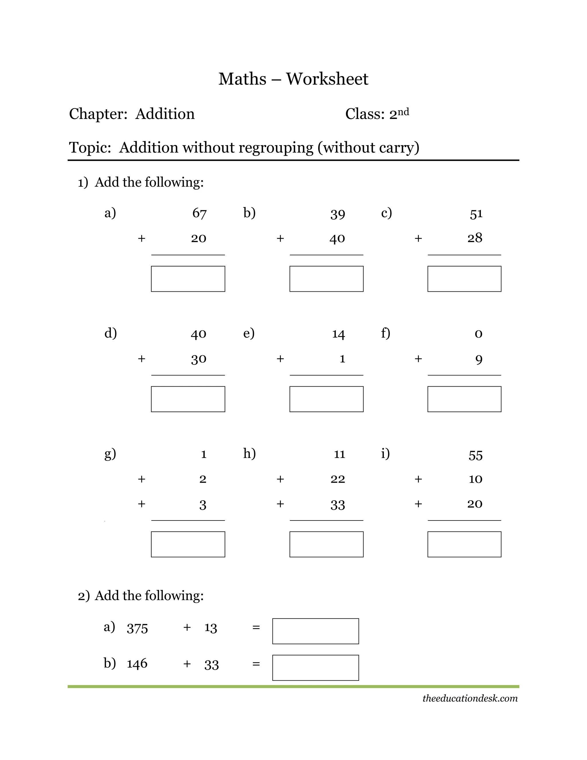 This document is a comprehensive math worksheet for 2nd-grade students, focusing on addition with and without regrouping, including various exercises. It contains problems ranging from single-digit to three-digit addition, as well as story problems that apply these concepts in real-life scenarios. Additionally, there are sections for matching pairs with their corresponding sums and problems designed to help students understand addition using expanded forms.
