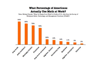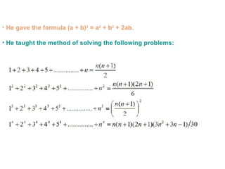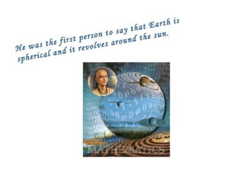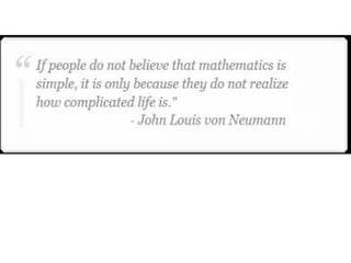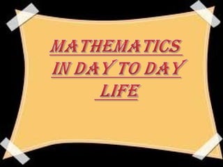 This document discusses the prevalence and importance of mathematics in everyday life. It provides examples of how mathematics is used in areas like health, weather, transportation, society, and more. While some applications are directly observable, others involve more complex systems that are still being understood mathematically, like DNA. The document also discusses the historical foundations of mathematics over centuries, with concepts building upon each other like a pyramid, and provides a brief biography of the mathematician Aryabhata, who made important contributions in astronomy and mathematics.