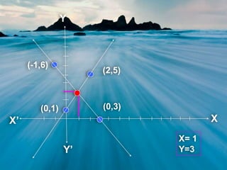2) Algebraic methods include substitution, elimination, and cross-multiplication. Substitution involves solving one equation for one variable and substituting it into the other equation. Elimination eliminates one variable by multiplying/adding equations.
