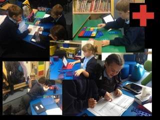 This document discusses using iPads in the classroom beyond just math. It outlines the current practices at the school including pre-assessments, problem solving activities, and using apps to support learning. The school also uses online portfolios and has received positive external reviews. It emphasizes the importance of growth mindsets, increased challenge, and student ownership of learning both currently and for the future direction of the school.