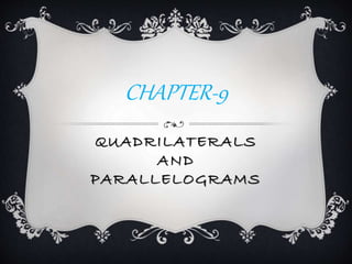 This document presents information about quadrilaterals and parallelograms. It defines a quadrilateral as a plane figure bounded by four line segments and lists the main types: parallelogram, rectangle, square, and trapezium. It outlines the key properties of parallelograms including having opposite sides that are parallel, equal in length, and opposite angles that are equal. Theorems state that the diagonals of parallelograms bisect each other and each diagonal bisects the parallelogram. Converses of these theorems are also provided, along with intercept theorems. The document was presented by Gargie Das from class IX 'A'.