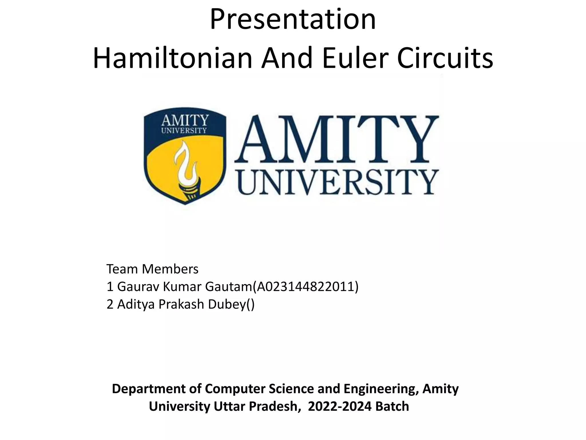 1. The document discusses Hamiltonian and Euler circuits in graphs. It defines Hamiltonian and Euler paths and circuits, noting that Hamiltonian circuits visit every vertex once while Euler circuits use every edge once.