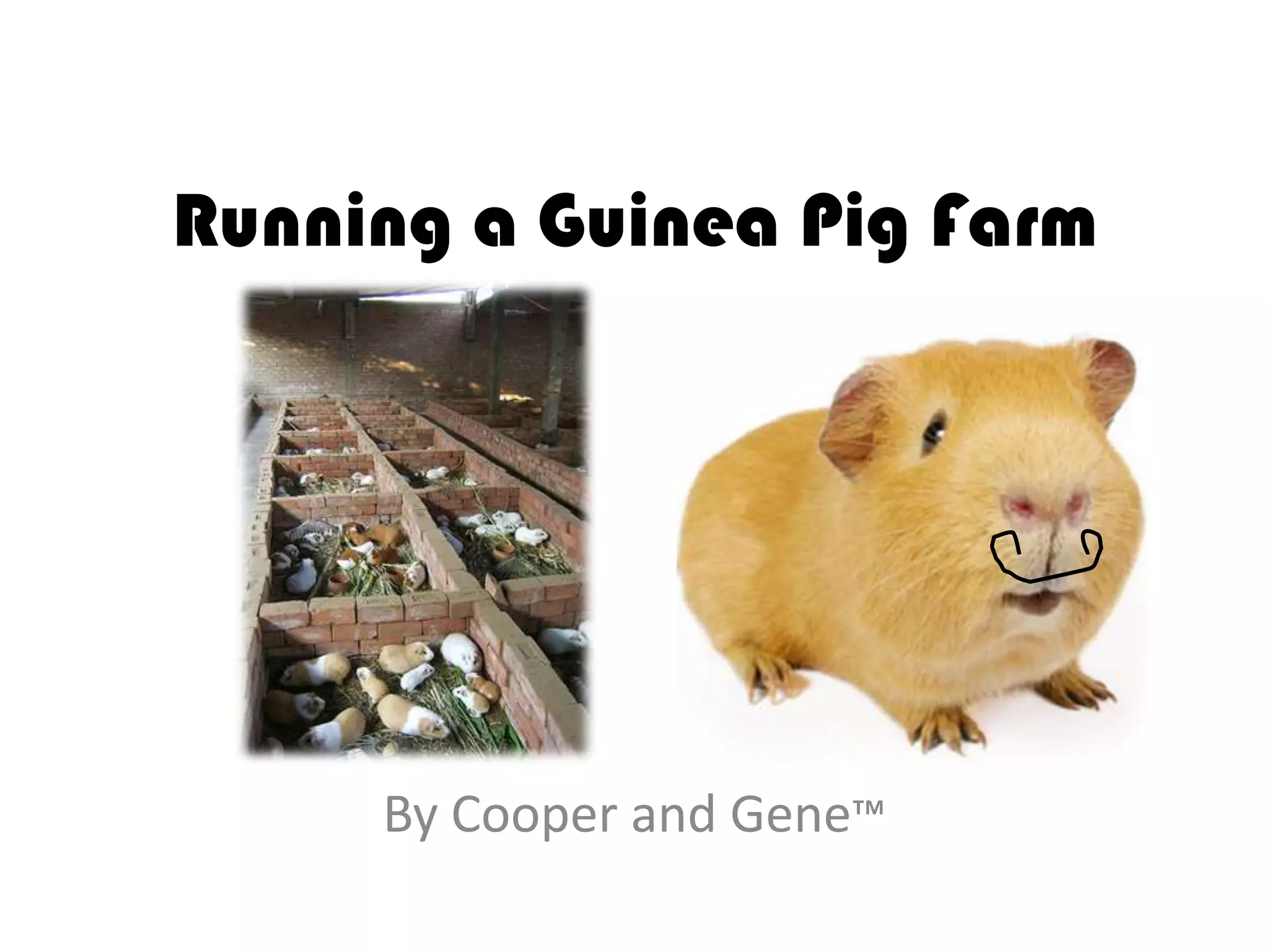 The document outlines plans to run a guinea pig farm with 100 guinea pigs. It calculates that the guinea pigs will need 365000 pieces of vegetables per year and 3.65 grams of vitamin C per guinea pig annually. It also estimates that the cages will need to be cleaned 3640 times a year and approximately 1250 baby guinea pigs will be born at the farm each year.