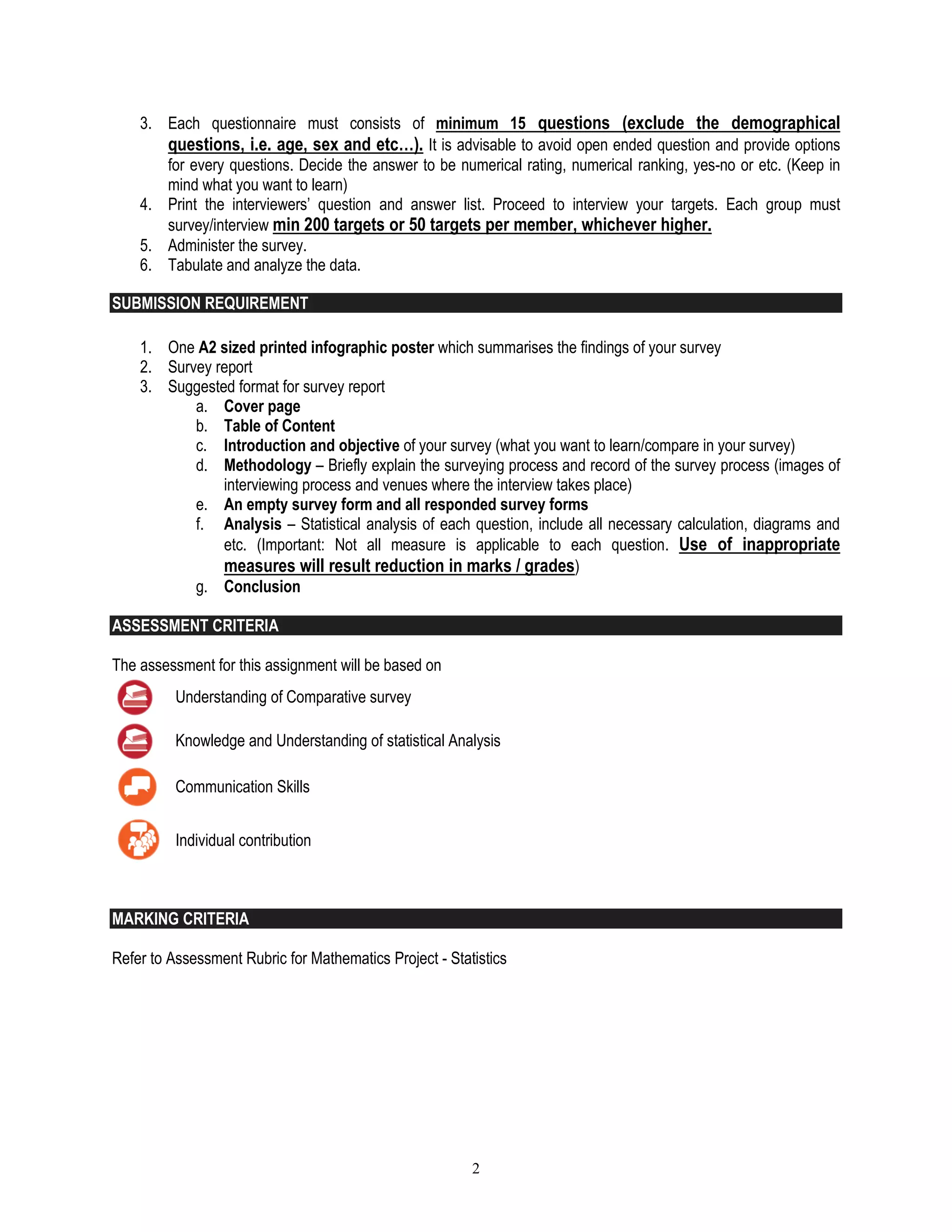 This document outlines the requirements for a statistics project assigned to students. It instructs students to work in groups of 4-5 members to conduct a survey comparing understanding of a chronic disease between male and female students. The survey must include at least 15 questions and interview a minimum of 200 targets. Students are assessed based on their understanding of comparative surveys, knowledge and application of statistical analysis, communication skills, and individual contribution. A report and infographic poster summarizing the findings must be submitted. Peer and self-assessment of contributions is also required.