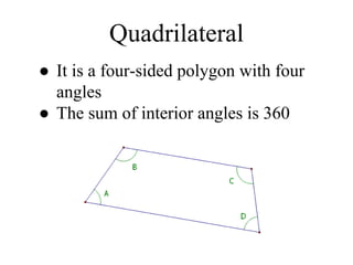 - A quadrilateral is a four-sided polygon.