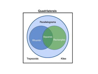 - A quadrilateral is a four-sided polygon with four interior angles summing to 360 degrees. Specific types include squares, rectangles, parallelograms, rhombuses, kites, trapezoids, and cyclic quadrilaterals.