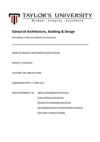 The document is a statistical analysis report from a survey conducted on understanding of cataracts eye disease. It provides statistical analysis of responses from 200 students (44.5% male, 55.5% female) at Taylor's University. The analysis examines responses to questions on causes, prevention, treatment and symptoms of cataracts. It finds that overall understanding is moderate, with females showing slightly better understanding than males on some questions. The report uses tables, charts and percentages to analyze responses for each question.