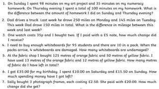 This document provides math lessons and activities for students in Year 4. It includes multiplication tables to practice, word problems to solve using addition and subtraction, and lessons on doubling and halving two-digit numbers. Students are encouraged to contact their teacher if they have any questions.