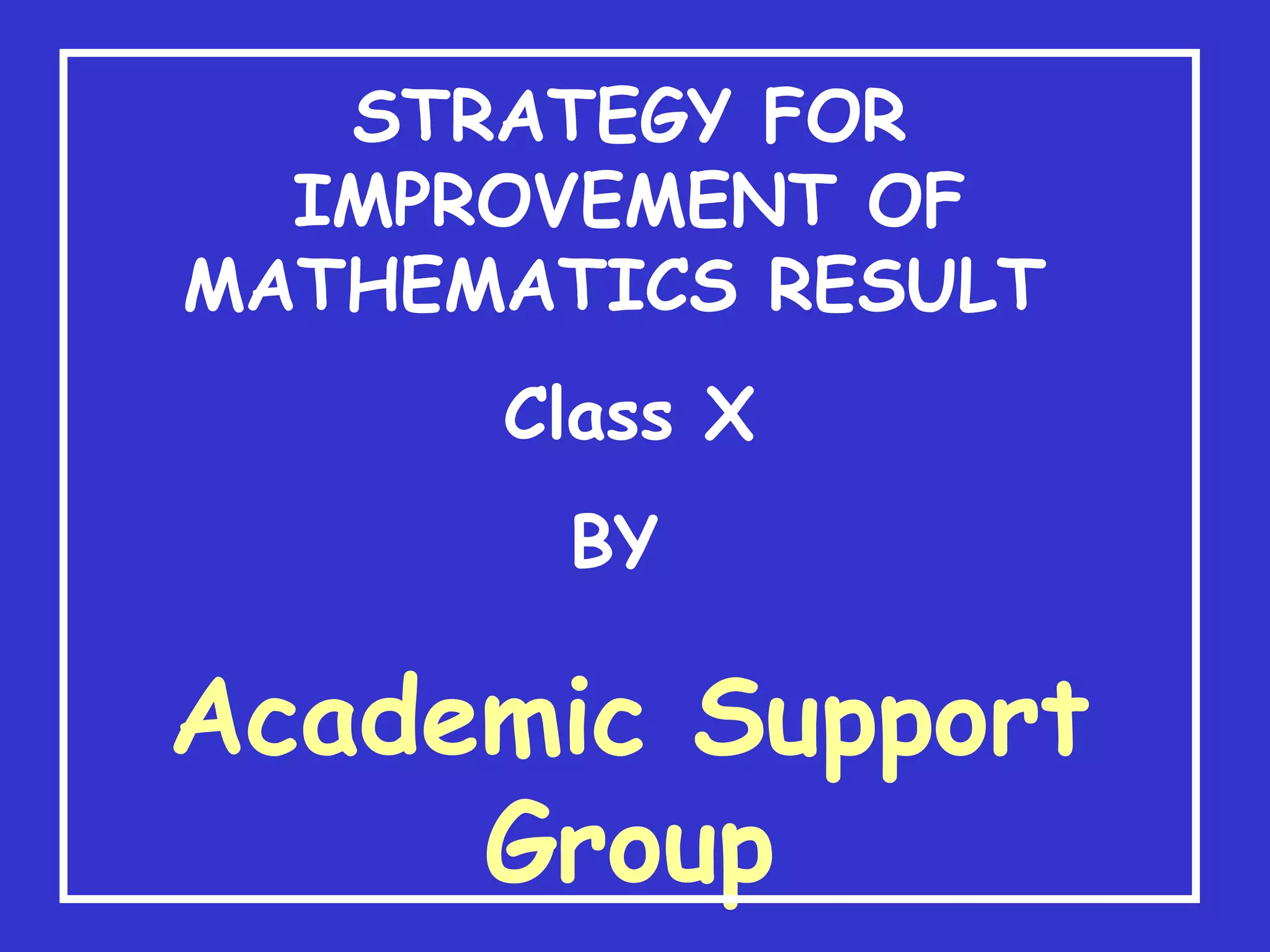 The document outlines strategies to improve mathematics results for Class X students. It analyzes factors responsible for poor mathematics performance, such as phobia of the subject, lack of practice, and faulty teaching methods. Steps for improvement include focusing on mental math skills, introducing short courses, encouraging more practice, and improving teacher accountability by analyzing results by teacher. Sample questions are provided covering topics like algebra, arithmetic progressions, and quadratic equations at varying difficulty levels. Common student mistakes and ways to emphasize key points for each topic are also discussed.