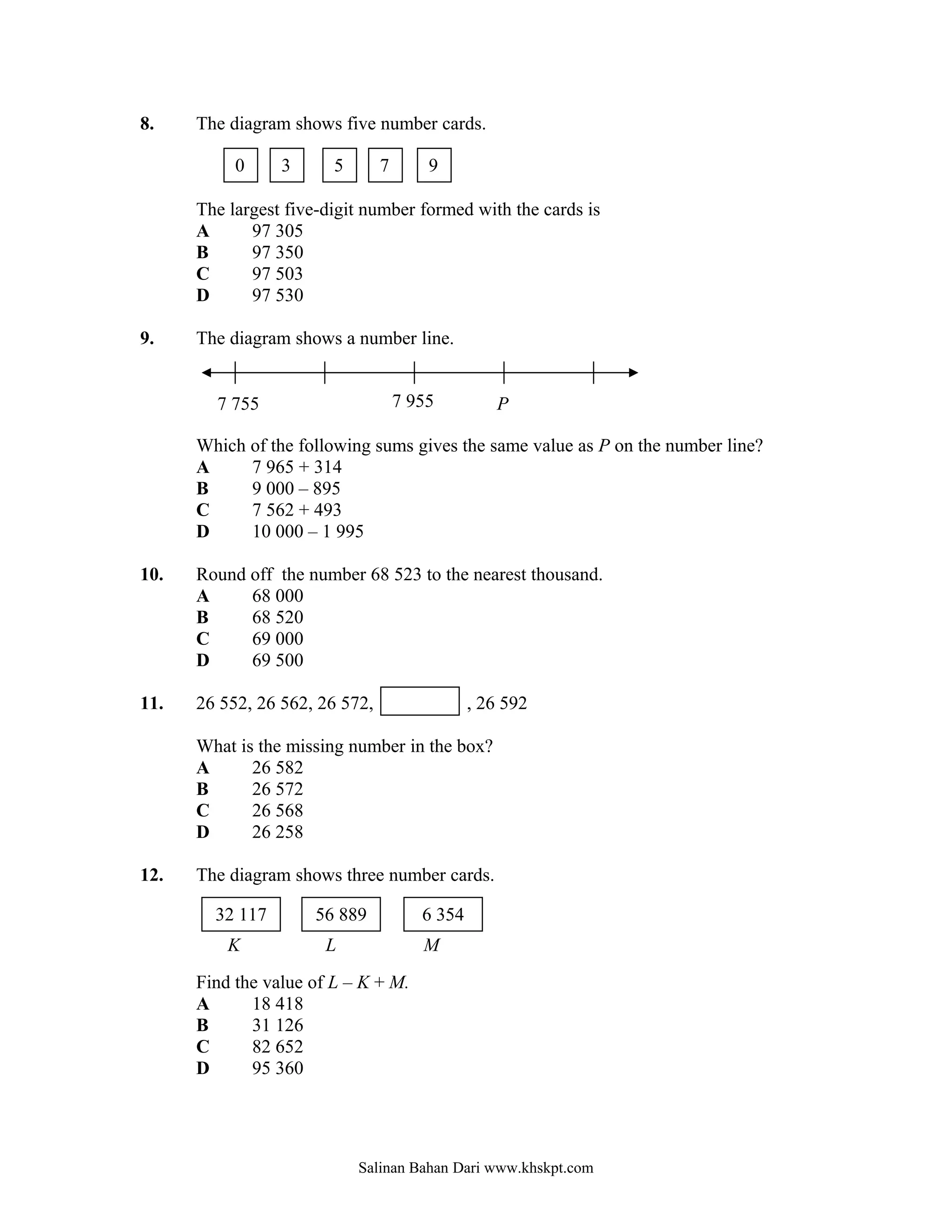 This document contains 24 questions about operations on whole numbers, including addition, subtraction, multiplication, division, rounding, place value, and word problems. The questions start with multiple choice questions testing skills like writing numbers in words, operations with multi-digit numbers, and comparing values. Later questions are short answer and involve calculating sums, differences, products, quotients and remainders of multi-digit numbers. Word problems cover topics like number of items, ticket sales, and production quantities.