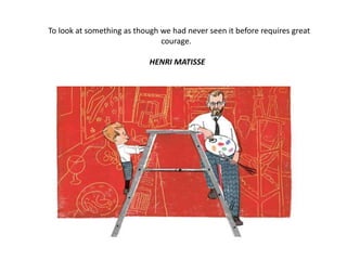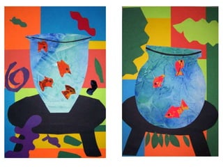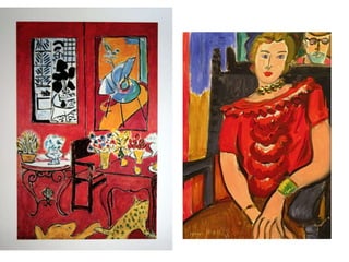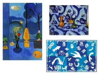 Henri Matisse was a famous French painter known for his use of bold color. He originally wanted to be a lawyer but discovered his passion for painting after being bedridden from illness. Matisse learned painting techniques by copying works at the Louvre museum but later focused on color, joining the Fauvist movement that emphasized expressive color over realism. In old age, Matisse created cut paper collages when illness made painting difficult, cutting shapes from colored papers that he arranged to form compositions.